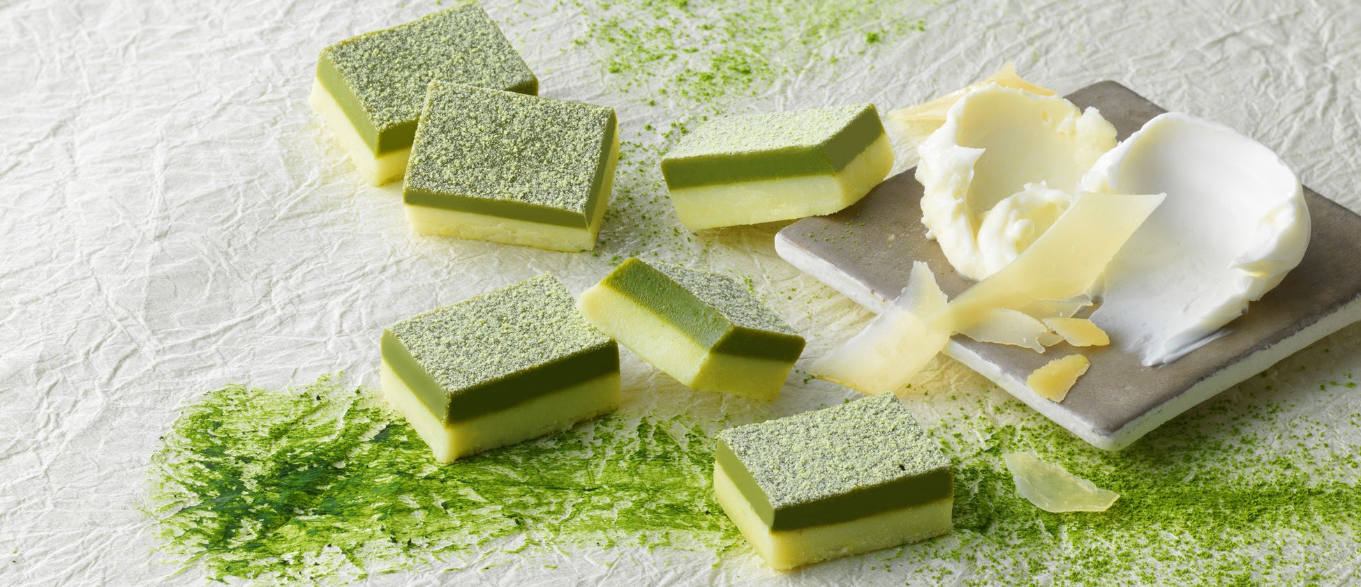 京都府産宇治抹茶をブレンドしたホワイトチョコレートと、北海道産の3種のチーズ(マスカルポーネ、ゴーダ、クリームチーズ)を使用したホワイトチョコレートを2層に重ねました。表面には宇治抹茶を使用したチョコレートのパウダーをかけ、さらに深みを足しています。