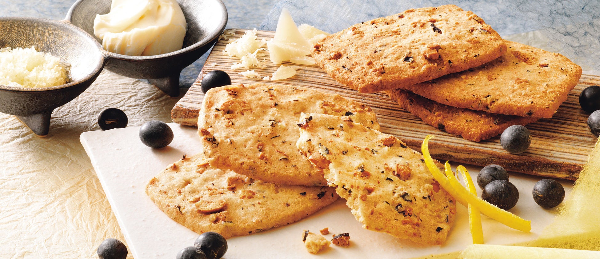丹波黒豆を生地にブレンドし、アクセントに塩を入れた和風サブレ。生地にウォッカを加えることで、食感にかろやかさを出しました。京都府水尾のゆずを使ったゆずピールをブレンドした[ゆず]と、パルメザンチーズ・ゴーダチーズ・クリームチーズの3種をブレンドした[チーズ]の2種類のセットです。