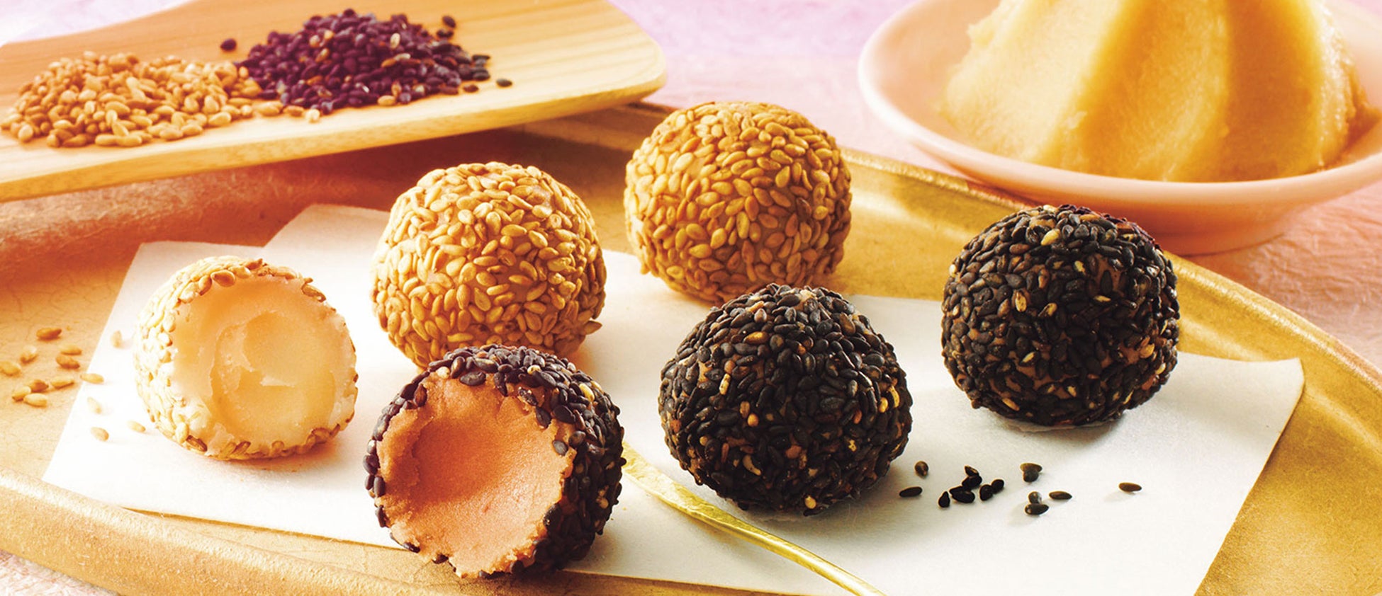 西京味噌とホワイトチョコレートを練り込んだ白あんを丸め、仕上げにごまをまぶしました。[金ごま]と[黒ごま]の2種類の味わいのセットで、それぞれの風味の違いもお楽しみいただけるひと箱です。