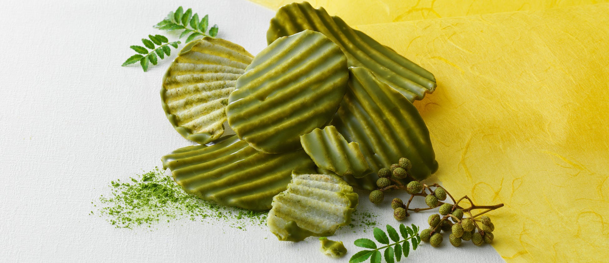 抹茶と和歌山県産ぶどう山椒をまぶしたポテトチップの片面に、宇治抹茶のチョコレートをコーティングしました。隠し味にピスタチオのペーストを入れています。口に入れた瞬間にピリッとさわやかに広がる山椒と、ポテトチップの塩味、抹茶チョコレートのほろ苦いコクと甘さがクセになる味わいです。