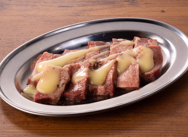 タン先・タン中・タン元のすべてが味わえるようにカットされた、贅沢な厚切り牛タン。一口噛めば、ガーリックバターがたっぷり絡んだ牛タンのジューシーさが広がり、食べごたえ抜群の一品です。