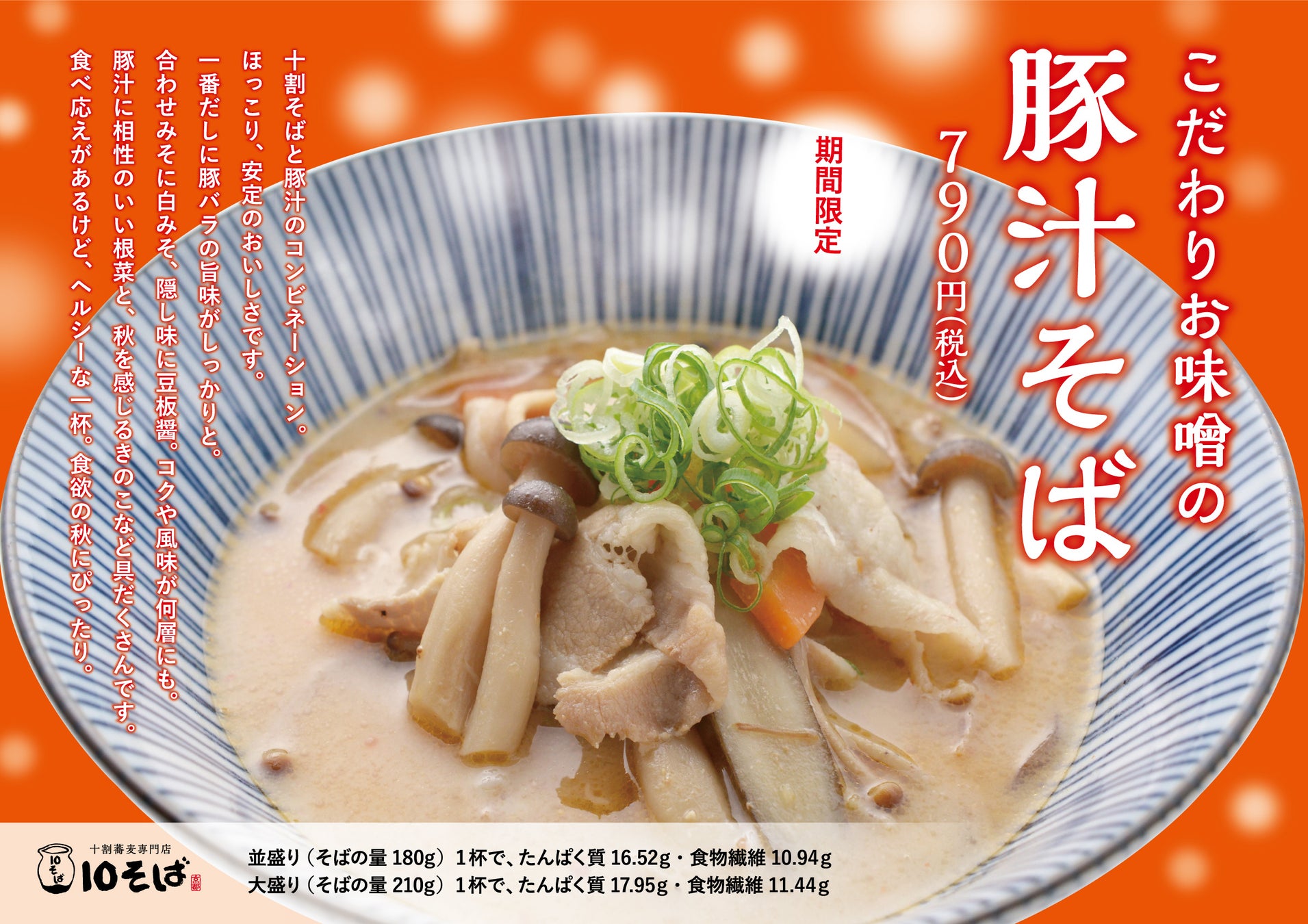 よーじやグループ(京都府京都市中京区、代表取締役・國枝昂)が運営する「十割蕎麦専門店10そば」は、2024年9月29日(日)より期間限定で「こだわりお味噌の豚汁そば」を提供開始いたします。ほっこりおいしい豚汁は、コクがたっぷりの合わせみそと秋を感じるきのこなど具だくさん。また、10月10日(木)は年に1度の「超10そばの日」として、無料券などのお得なクーポンを配布するキャンペーンを京都・大阪の両店舗で実施いたします。