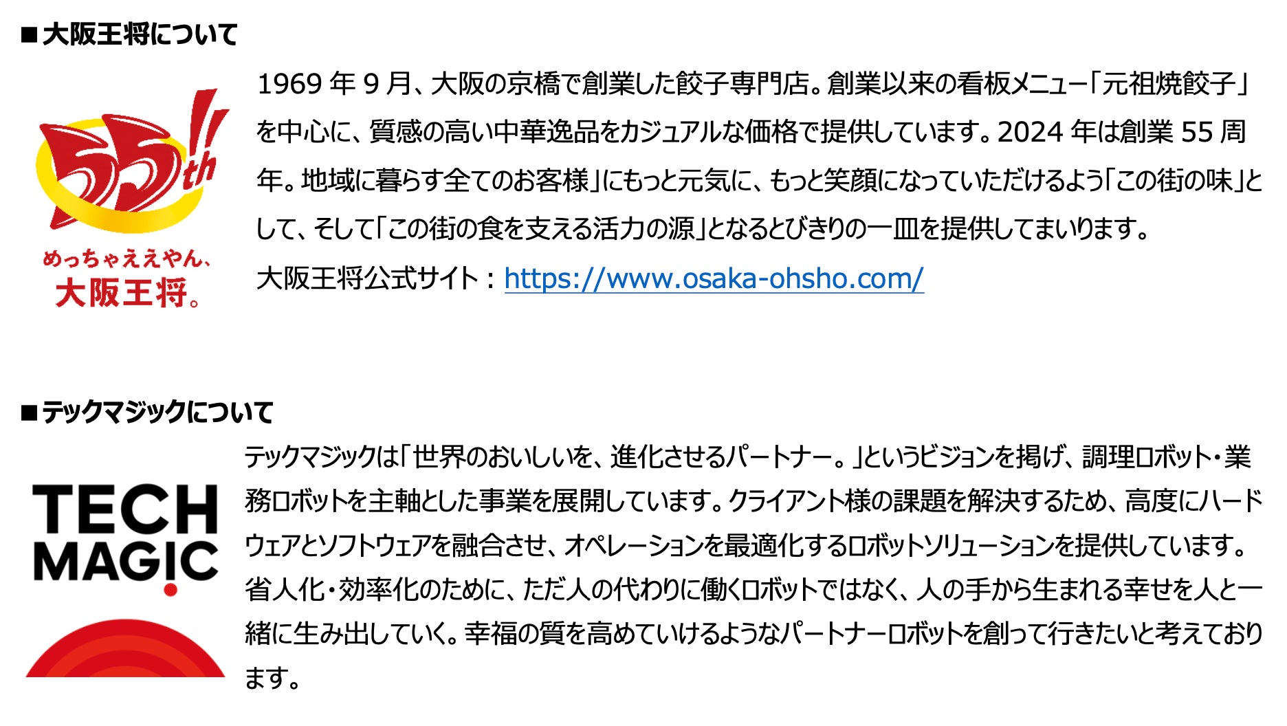 ロボット技術でおいしいを革新するTECHMAGIC株式会社(本社:東京都江東区、代表取締役社長:白木裕士、以下 「テックマジック」)は、餃子専門店「大阪王将」を運営する株式会社大阪王将(東京ヘッドオフィス:東京都品川区、代表取締役社長:文野幸司、以下「大阪王将」)が創業55周年の機に9月にオープンした新モデル店舗『大阪王将鷺沼駅前通り店』へ、初となる炒め調理ロボットの最新モデル「I-Robo2」を導入いたしました。