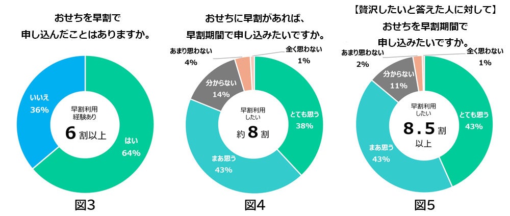 さらに、2025年のお正月に、「食の贅沢をしたい」と答えた365名に、おせちに早期割引があれば早割期間で申し込みたいか尋ねたところ、「とても思う」「まあ思う」と回答した方が合わせて8.5割以上にのぼりました。(図5)