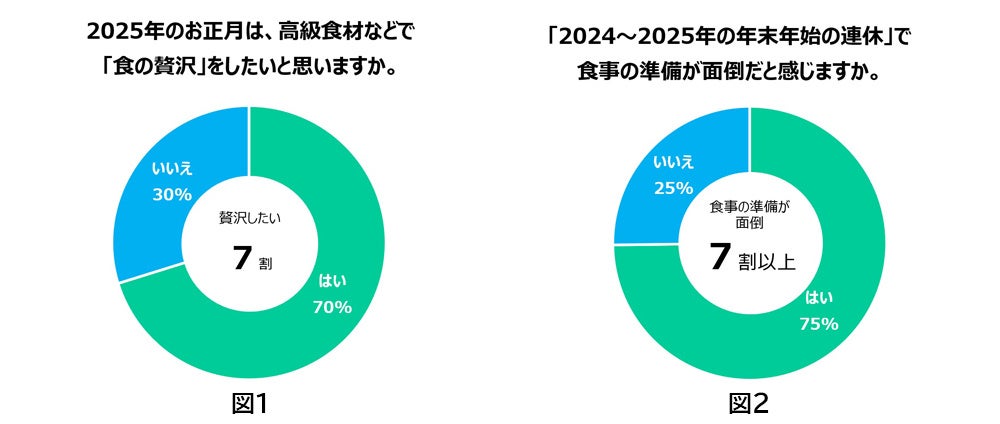 ファミリーマートが2024年9月に行った調査で、2025年のお正月に、高級食材などで「食の贅沢」をしたいと思うか尋ねたところ、7割の方が「贅沢をしたい」と答えました。(図1)また、2024年から2025年にかけての年末年始休暇は、多くの方が12月28日(土)〜1月5日(日)までで、2019年から2020年の年末年始以来5年ぶりの最大9連休の大型連休となります。「2024~2025年の年末年始の連休」で食事の準備が面倒だと感じるか尋ねたところ、7割以上の方が「面倒だと感じる」と答えました。(図2)