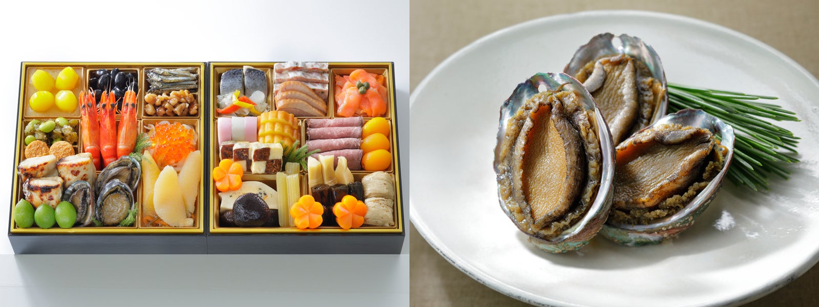 多彩な味わいの和洋中三段重にあわびや和牛ローストビーフ、愛知みかわ豚の黒酢酢豚、石川県産食材など、プレミアム食材をふんだんに盛り込みました。