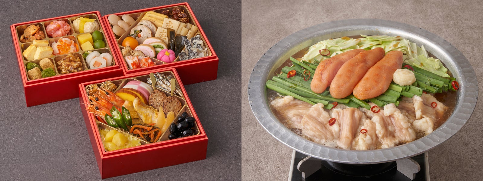 伝統的なおせち食材を盛り込んだおせちに、背徳感のあるにんにくマシマシの明太子もつ鍋をセットにしました。