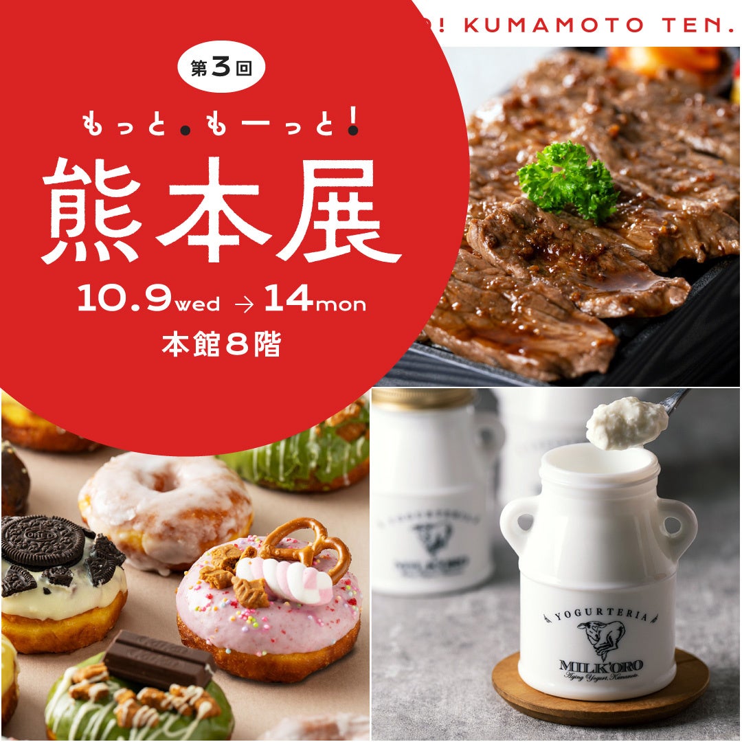 「第3回もっと、もーっと熊本展」を大丸福岡天神店にて開催します!今回は、新規店舗が23店舗加わり、総勢55店舗が一堂に集結します。熊本が誇る絶品肉『くまもとあか牛』『天草大王』『馬肉』といった人気の定番グルメをはじめ、ミシュランを獲得した話題の担々麺、こだわりのヨーグルト、熊本で大人気のドーナツ屋など、これでもかと熊本の魅力いっぱいなグルメを詰め込みました。熊本県民に愛されている人気グルメを福岡で楽しめる6日間、是非ご来場ください。