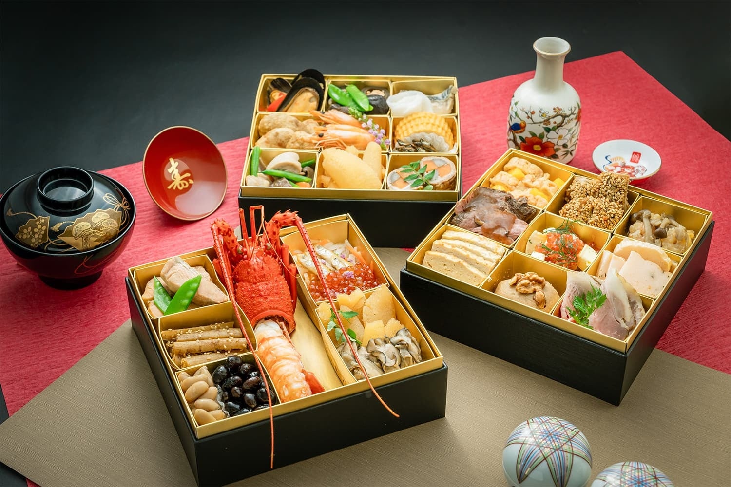 伊勢海老のグラタン、きのこのアーリオオーリオ、トコブシ姿煮、紅白なます、白いんげんとクルミのきんとん、うなぎの蒲焼き、牧草牛フィレ肉のタリアータ仕立て、帆立のタルタルキャビア添え、自家製ハム、海老のかまぼこ、燻製イカといくら・クリームチーズのマリネ、はちみつ鶏の七福焼き