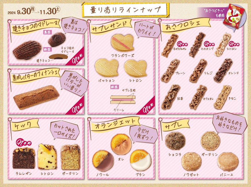 裏の焼きチョコが珍しい「焼きチョコのマドレーヌ」、焦がしたバターにこだわった「焦がしバターのフィナンシェ」、香り高いクリームをはさんだハート型の「サブレサンド」、ラム香る大人な「ケック ラムレザン」の新作焼菓子とUHA味覚糖の代表的スナックおさつどきっを使ったおさつロシェの新作「キャラメルサレ」、「シトロン」、「カカオニブ」を加えたチョコレートや焼菓子、サブレなどのバラエティに富んだラインナップを準備しました。ショコラティエが一つ一つ手作りしたお菓子を必要なだけちょっとずつ楽しむことができます。