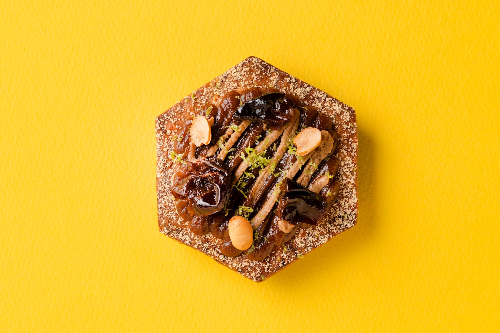北イタリア・マントヴァ発祥の伝統菓子「スブリソローナ」をイメージして仕立てたクリエイション。香ばしく焼き上げたクランブルのようなザクザク感が特徴的なビスケット。焙煎した小麦を使用することで独特の味わいを引き出し、焙煎したポレンタ(トウモロコシの胚乳を粗く粉砕したもの)の素朴な甘みとザラッとした舌触りが心地よく、ごろごろっと入ったヘーゼルナッツの食感とともにバニラやレモンゼストの爽やかでフローラルな香りが広がります。