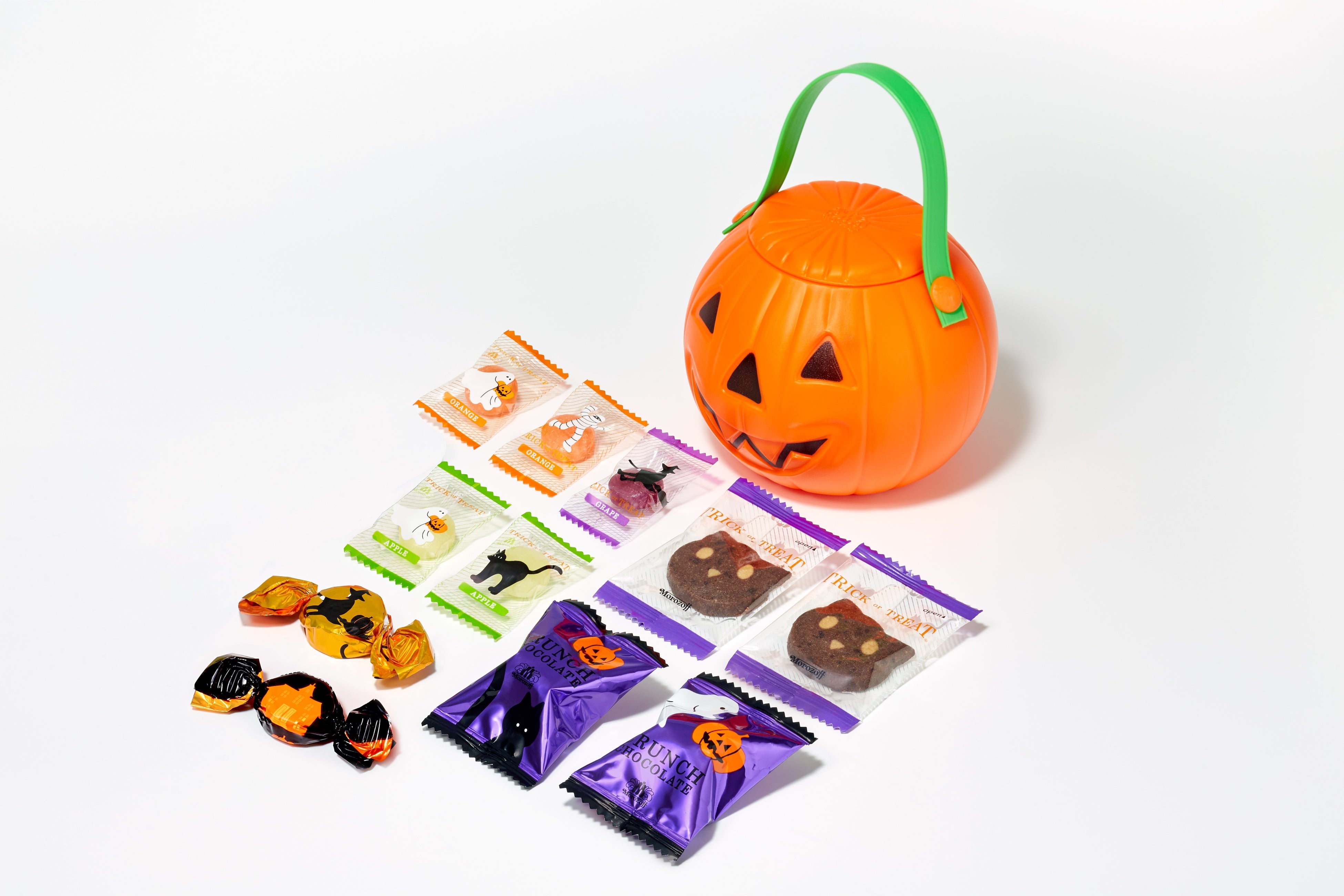 クランチチョコレートやキャンディー、クッキーを愛らしいジャック・オー・ランタンに詰め合わせました。