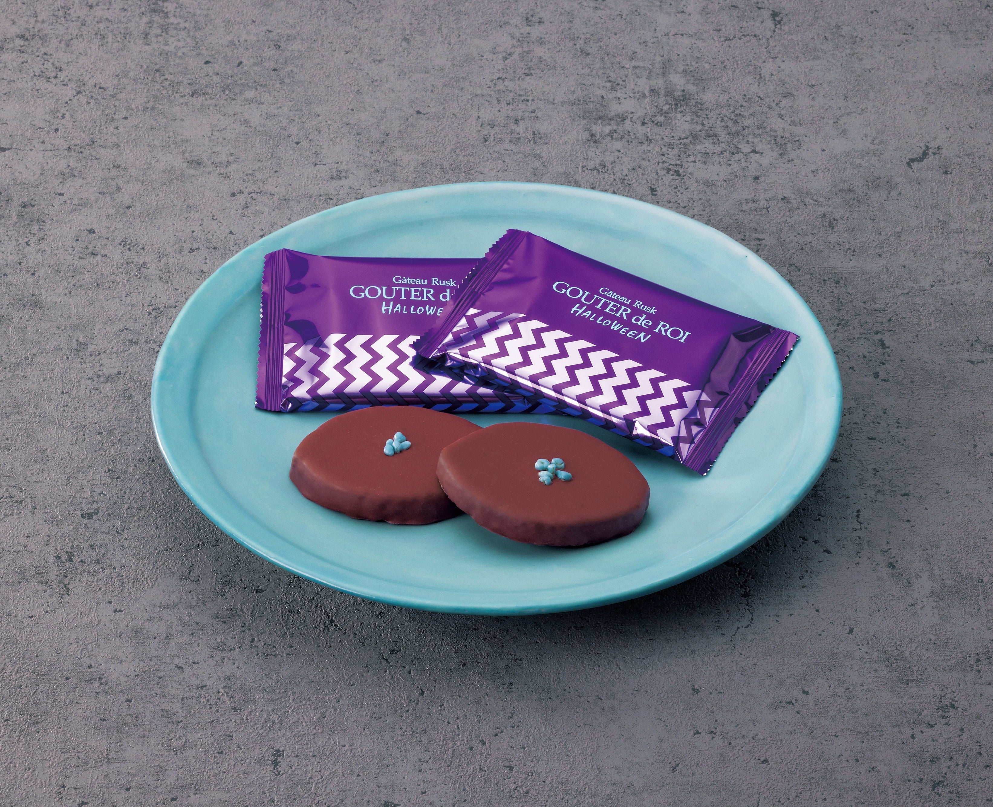 ミルクチョコレートにカシスを合わせた紫色のチョコレートで、ココアパウダーを練りこんだ黒いガトーラスクにコーティング。飾りの青いパチパチキャンディーは口の中で弾け、ハロウィーンを盛り上げる楽しい味わいに。