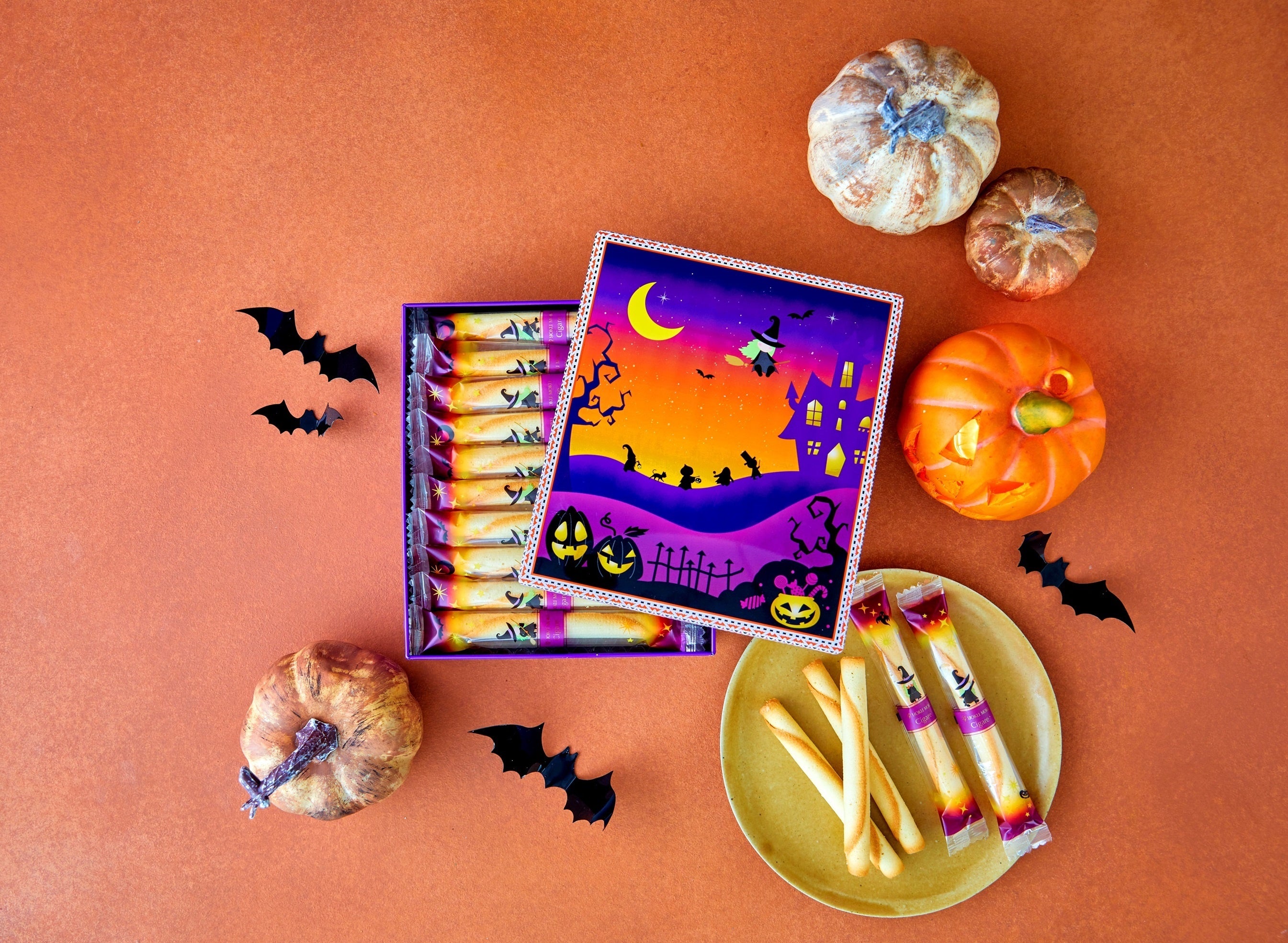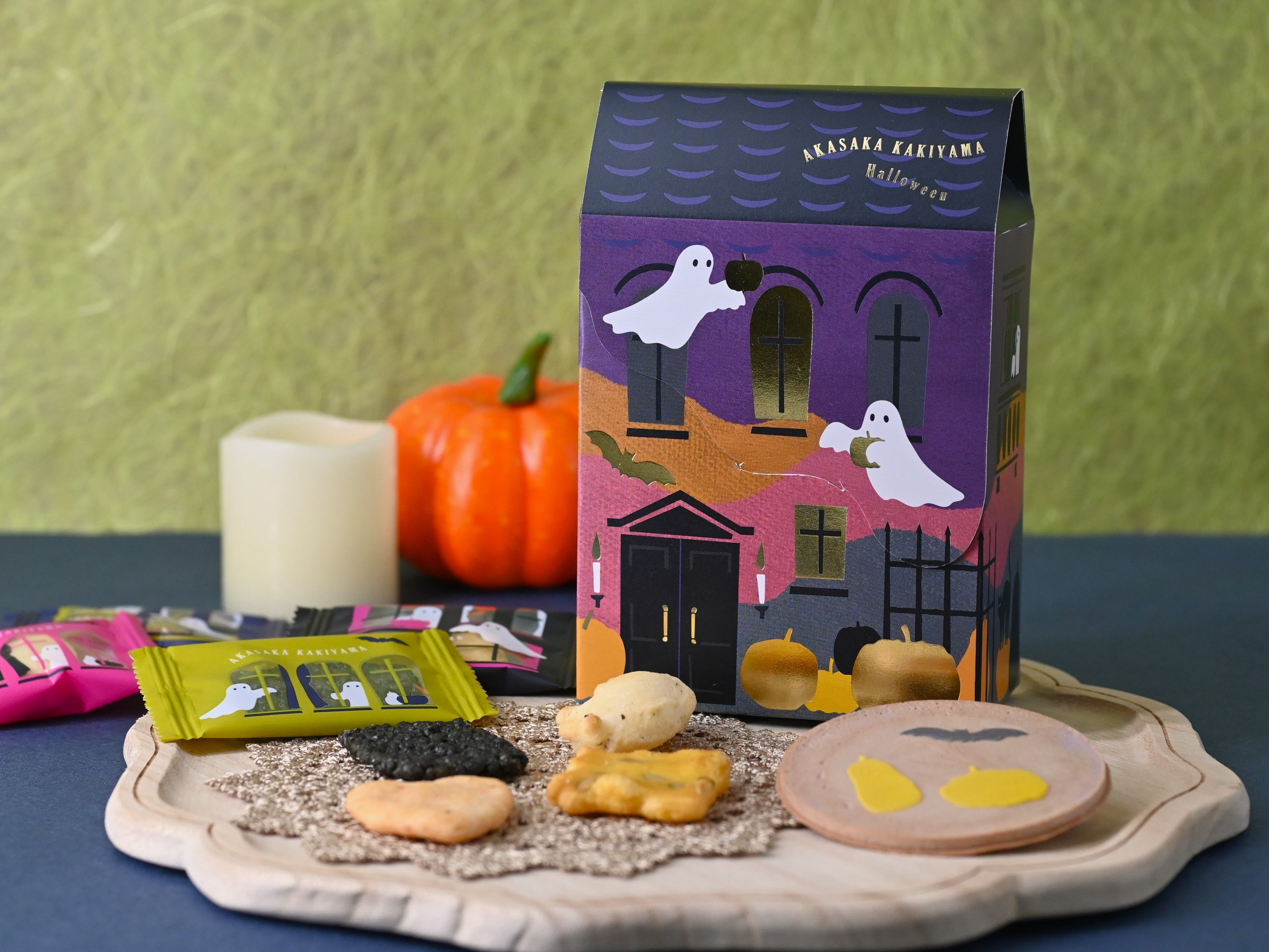 紫芋の玉子煎餅や竹炭カレーなどハロウィーンにぴったりのフレーバーが入った、季節限定の詰め合わせ。