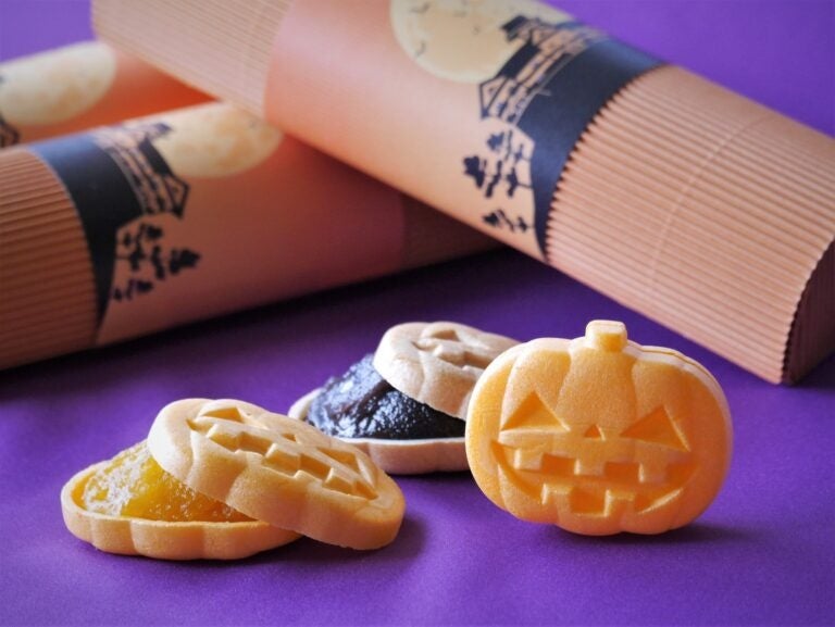 かぼちゃ餡とこし餡をジャック・オー・ランタンの形の最中に仕上げました。