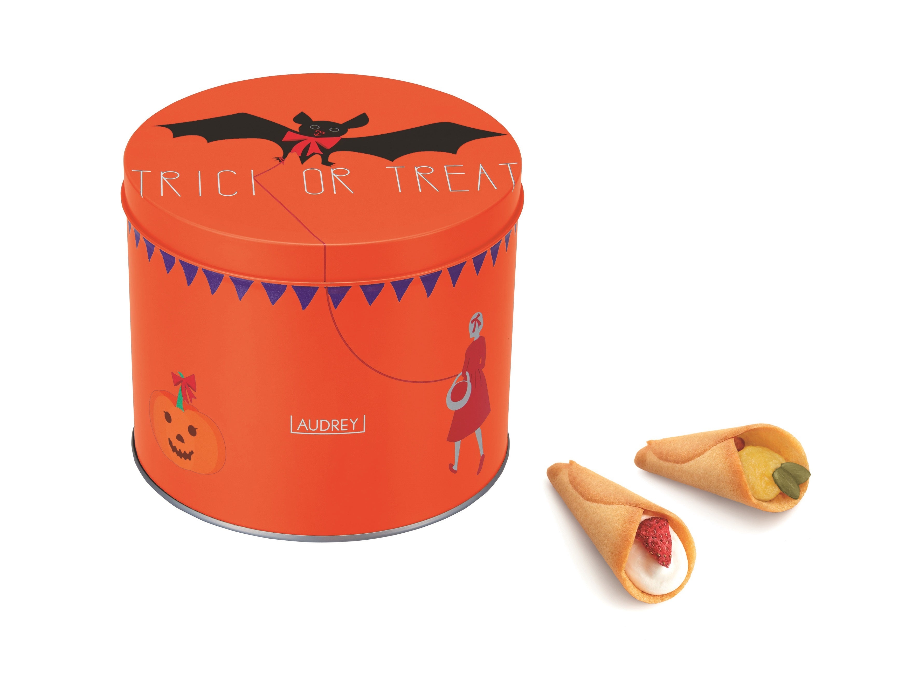 カボチャ味の蝶々おかきやイチゴ味のお化けクッキー、かぼちゃチップスなどを散りばめたハロウィーンにぴったりな限定缶です。