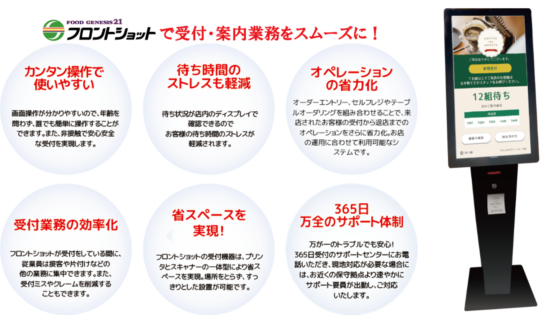 この「フロントショット」は、受付端末でお客様自身が受付登録を行っていただいた後、席のご案内票を印刷いたします。満席の場合は、順番登録され、お客様の順番になると呼出表示端末でアナウンスし、受付登録を行っていただく流れになります。受付・順番管理までが自動化できるため、スムーズな受付・案内業務ができ、従業員の業務負担を軽減し、お客様の待ち時間を短縮することができる受付システムです。
