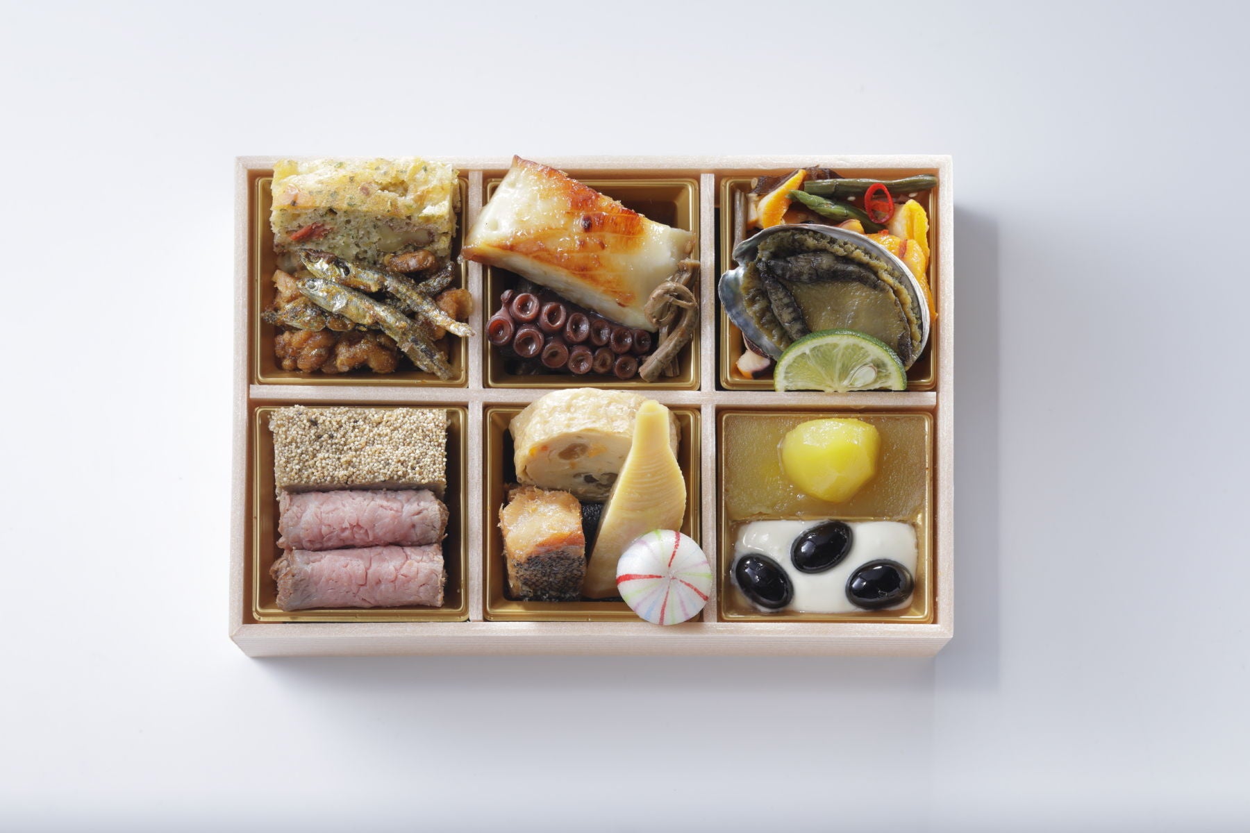 銀座 しのはら監修 ●合鴨松風 ●黒毛和牛ローストビーフ味噌漬/京ぎをん浜作主人監修 ●信田巻 ●鱈煮 ●筍土佐煮●手毬餅 /料理家 ぐっち夫婦監修 ●栗甘露煮 ●シナモン香る栗きんとん ●黒豆のマスカルポーネ&クリームチーズ和え