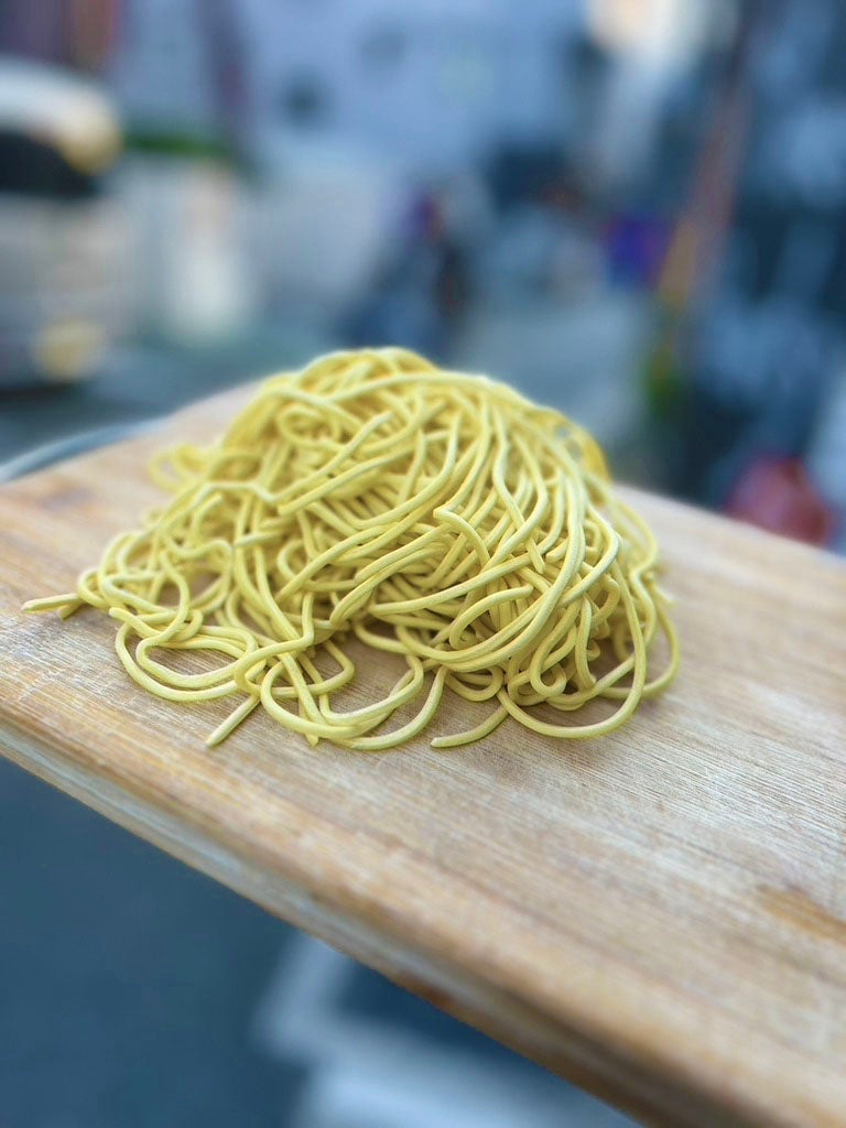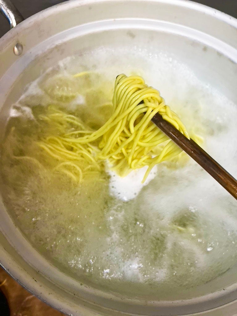 大きめの鍋に水をたっぷり注ぎ、十分に麺を泳がせて満遍なく茹で上げることで麺の持つ旨みの引き出しを最大限に活かしました。