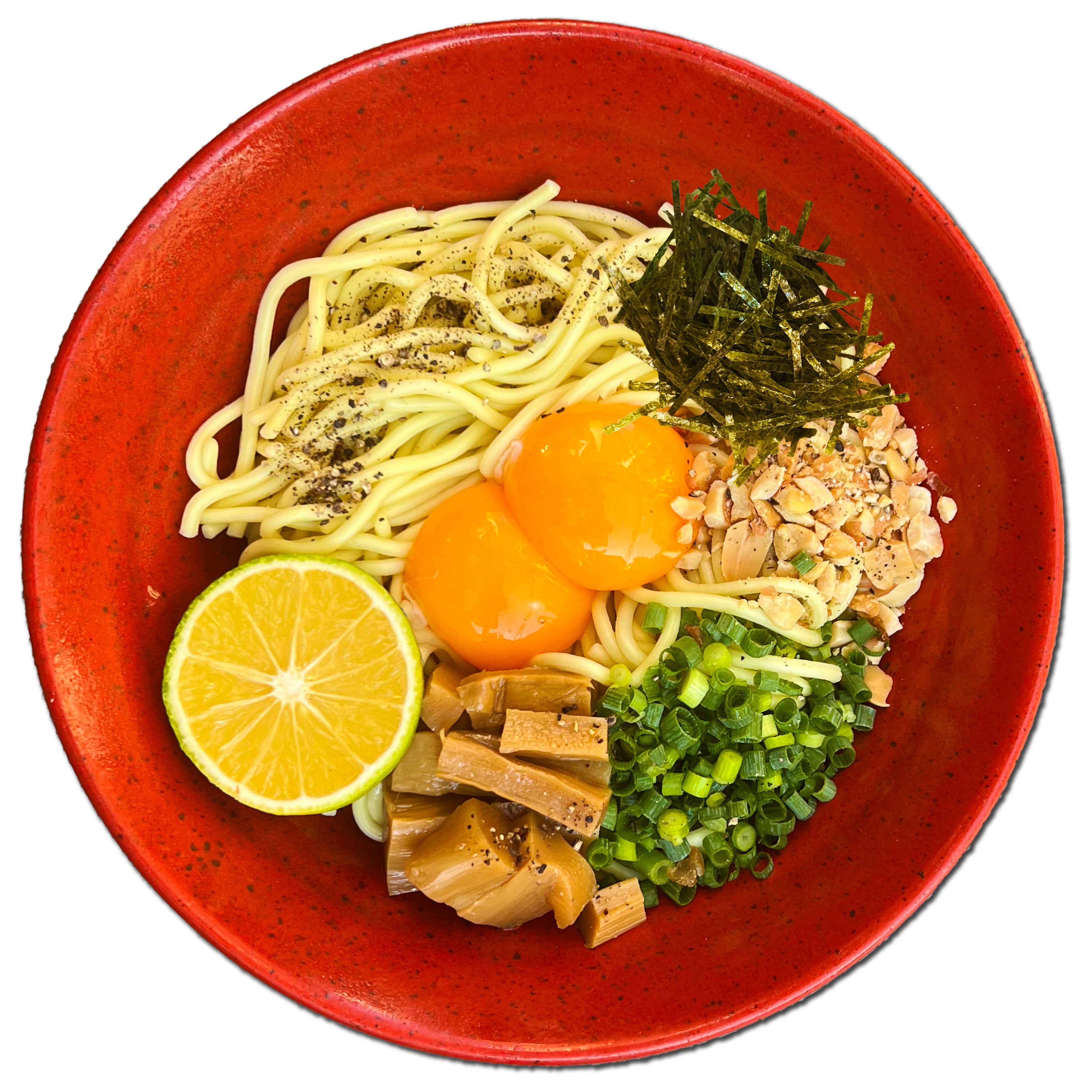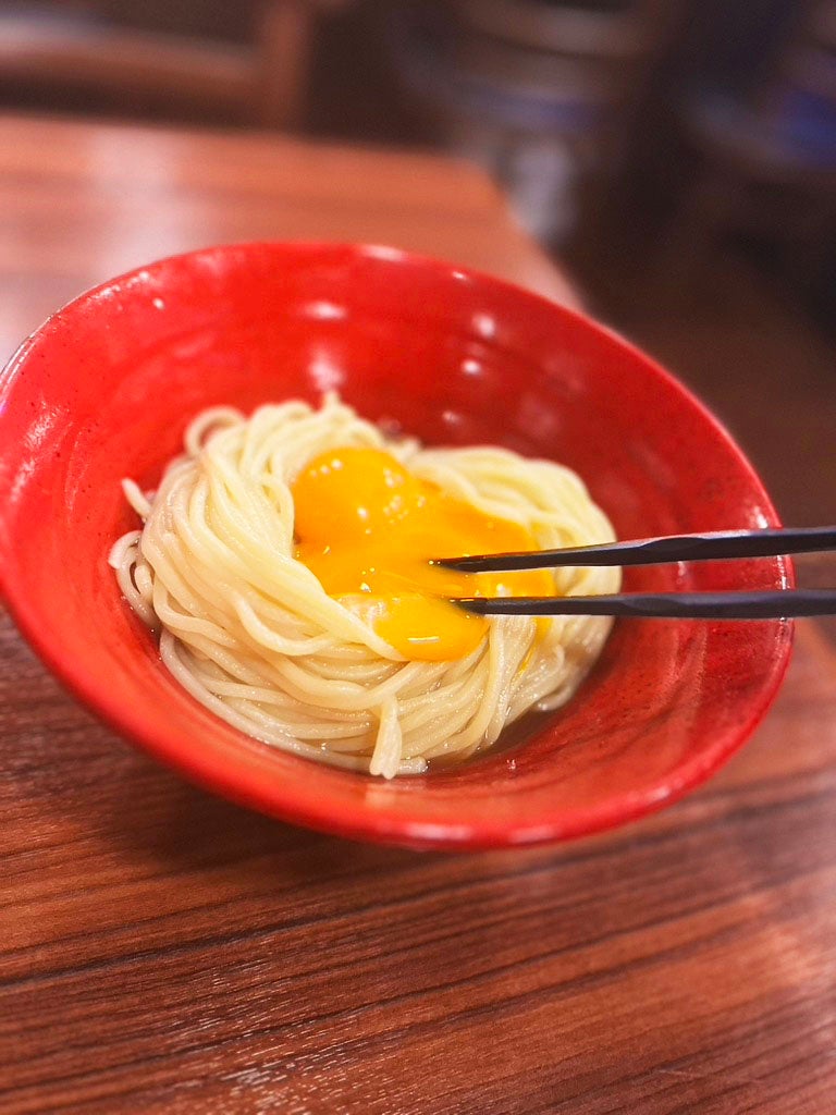 着丼したら麺、特製ダレ、調味油、卵黄をあったかいうちに一気にかき混ぜます。