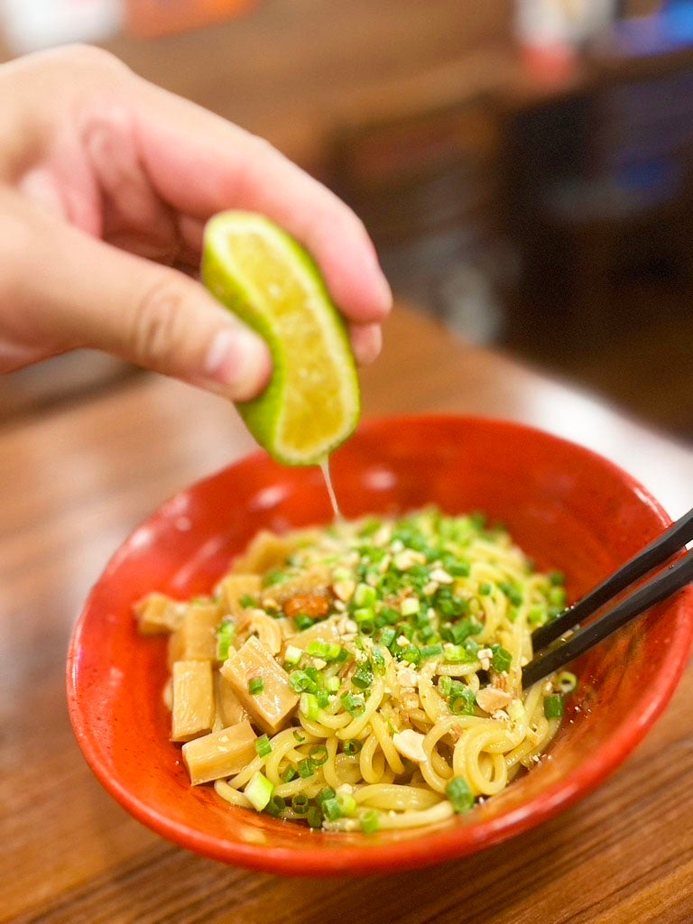 そして、備え付けの「刻みメンマ」「万能ネギ」「ローストナッツ」「カボス」を絞ってコシキ厳選の