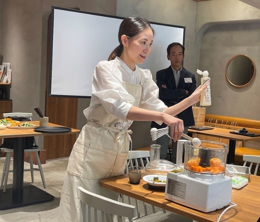 その後は野菜の料理家・西岡麻央さんが登場。普段から実践されている「食品ロス削減レシピ」を実演していただきました。「肉や魚と違って野菜はどうしても中途半端に余ってしまいませんか?本当は食べられる部分に栄養が多くあるのにも関わらず捨ててしまっている野菜が多い。」と話す西岡さん。今回ご紹介いただいたのは、かぼちゃの皮も無駄にしない「かぼちゃのグラッセ乗せアイス」と、「作業3分!絶品濃厚、にんじんドレッシング」の2品。