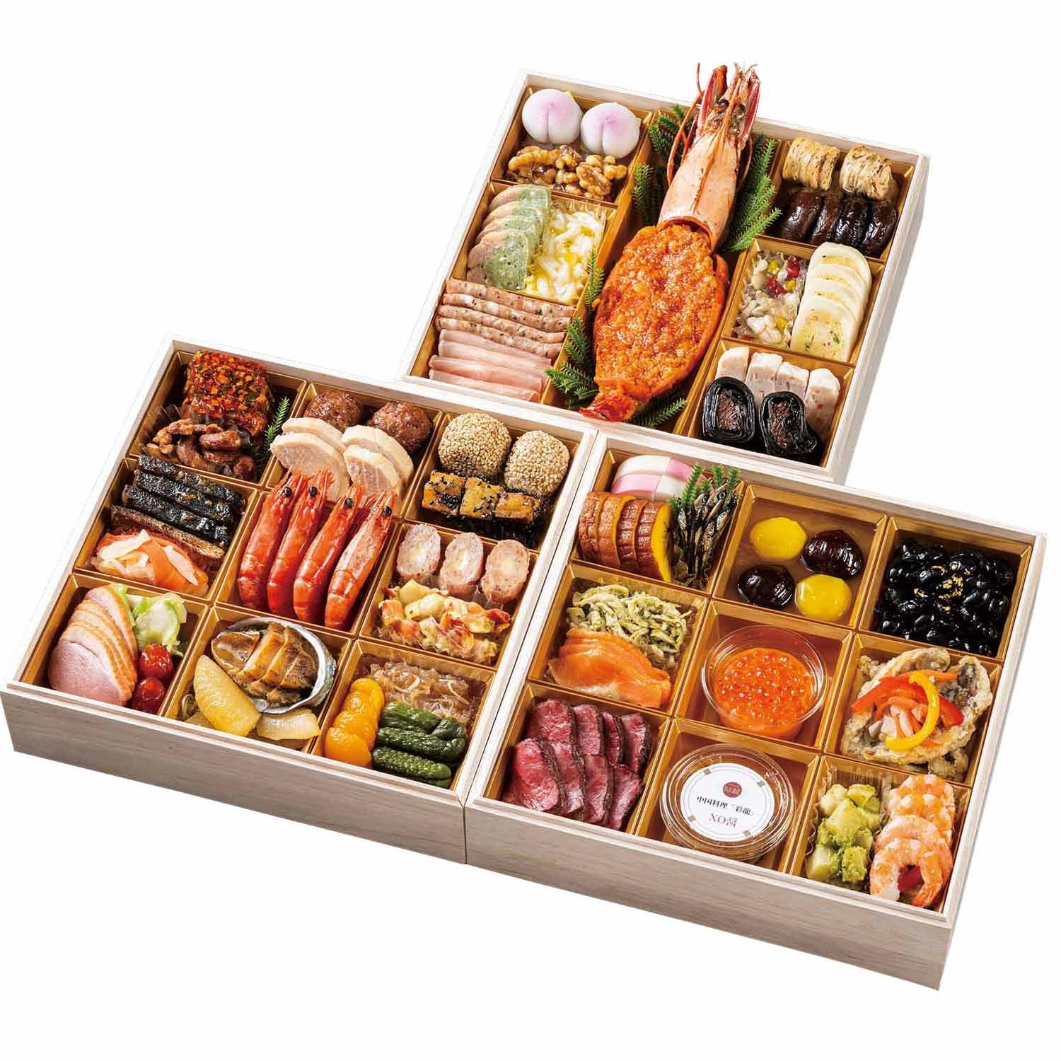 寿ぎのひとときにふさわしいこだわりの品を詰め合わせた和・洋・中の三段重です。