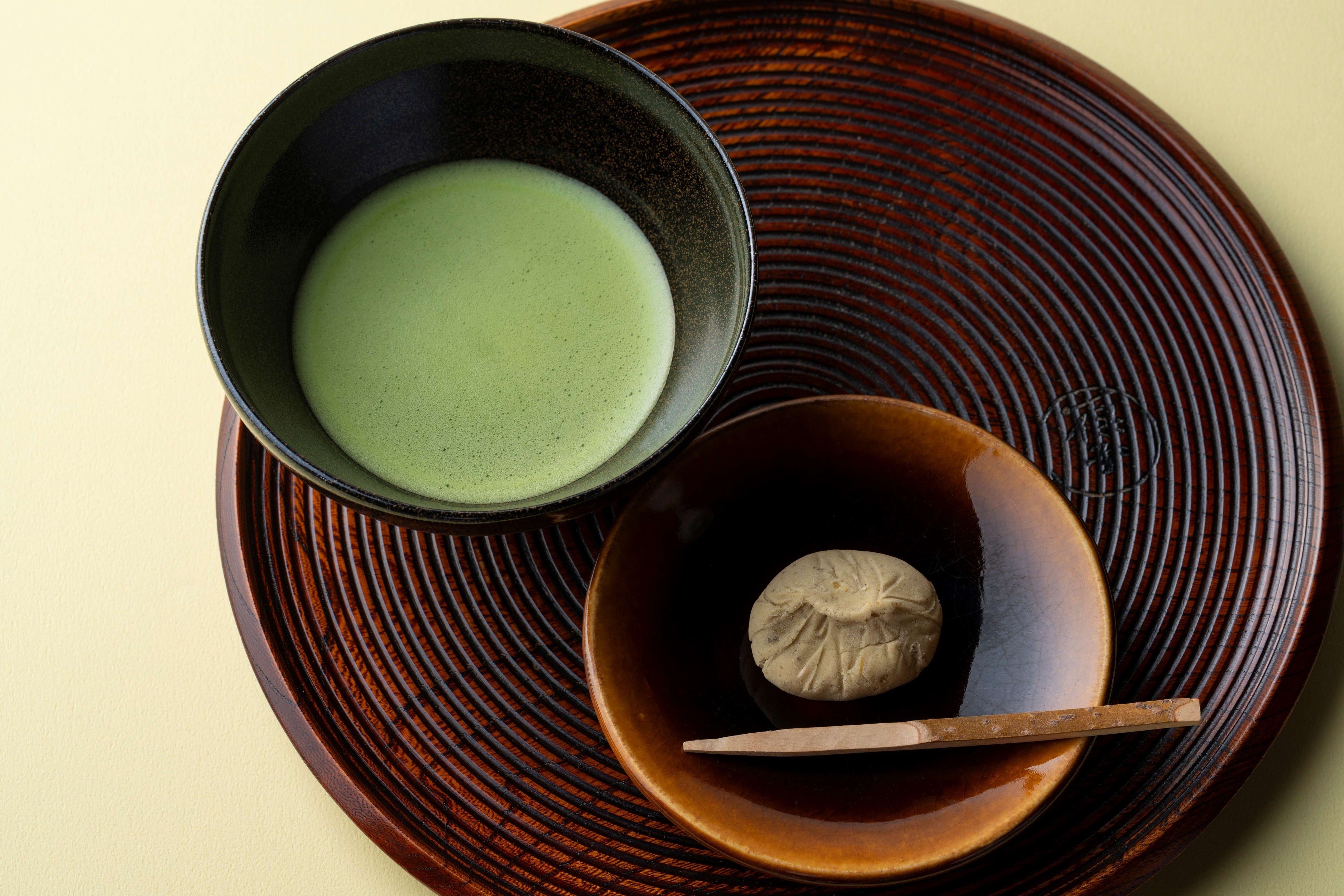 ほど良い旨みとほろ苦さを楽しめる抹茶と、栗と砂糖だけで作り、あえて少量残した粒状の栗がアクセントとなった「栗きんとん」の組み合わせです。