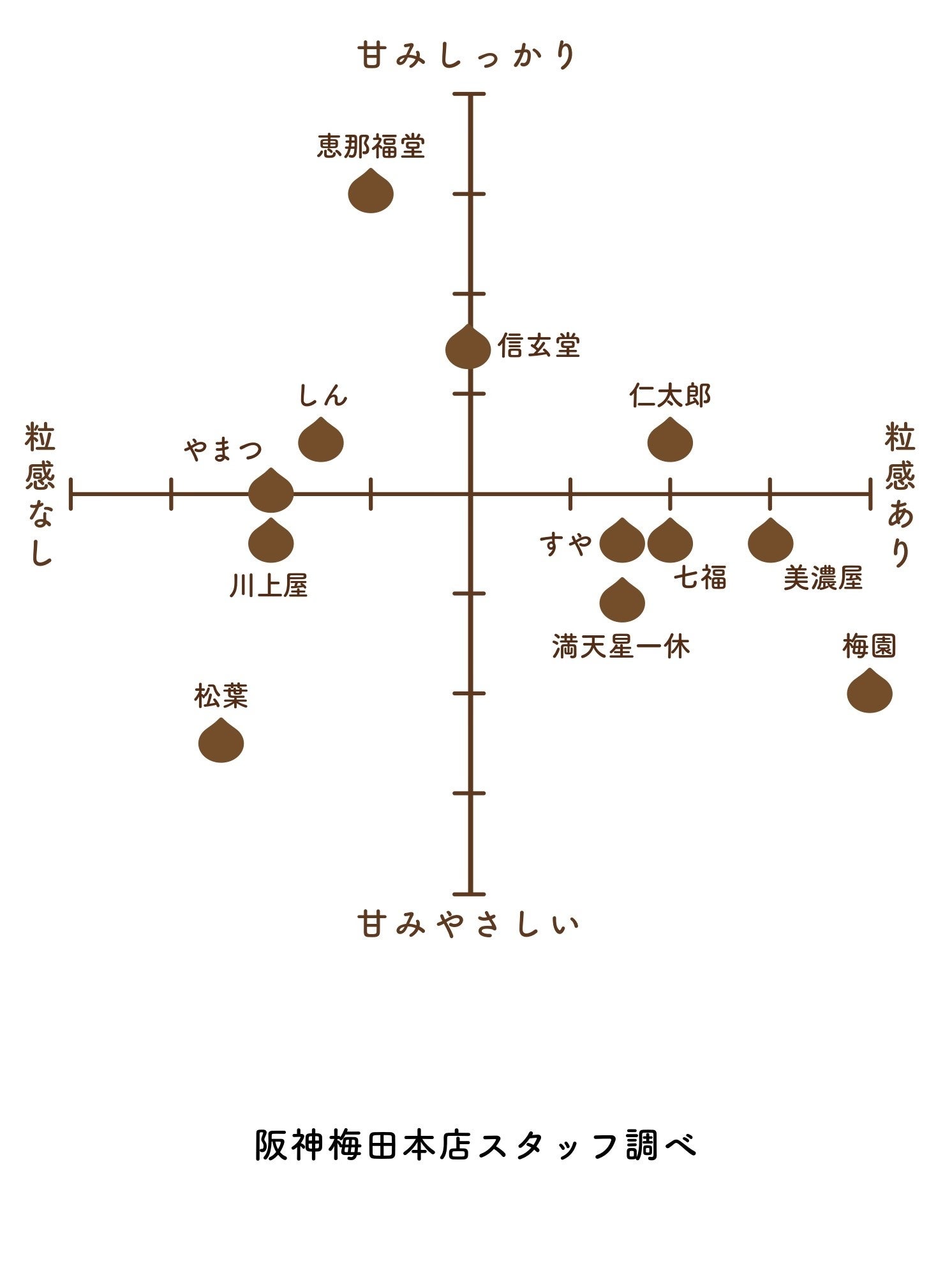 また、今年も阪神梅田本店のスタッフが全ての栗きんとんを実食し、『栗きんとんマトリックス』を作成。迷った際は、こちらを参考に食べ比べをお楽しみいただけます。
