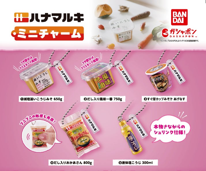 本コラボレーションでは、当社人気商品のパッケージと中身をボールチェーン付きのミニチャームで再現しました。みそのプニプニとした触感まで再現されており、見た目だけでなく触っても楽しいミニチャームに仕上がっています。
