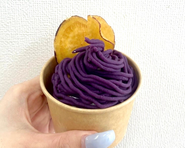 バウムクーヘンの上に生クリーム、紫芋ペーストをしぼり、さつまいもチップスをそえたカップクーヘンは、モンブランをイメージして考案しました。カップ入りのため持ち歩きやすく、また、インパクトの大きいビジュアルは手に取ったお客様がSNSにアップして、広く拡散されることを意識しています。バウムクーヘンとさつまいもの相性がよく、お値段以上に満足感のある一品です。