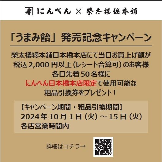 にんべん日本橋本店・榮太樓總本鋪本店で、税込2,000円以上(レシート合算可)お買上げのお客様に、互いの日本橋本店でご利用いただける粗品引換券をプレゼントいたします。
