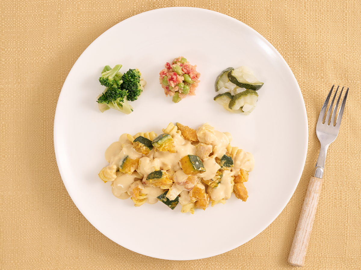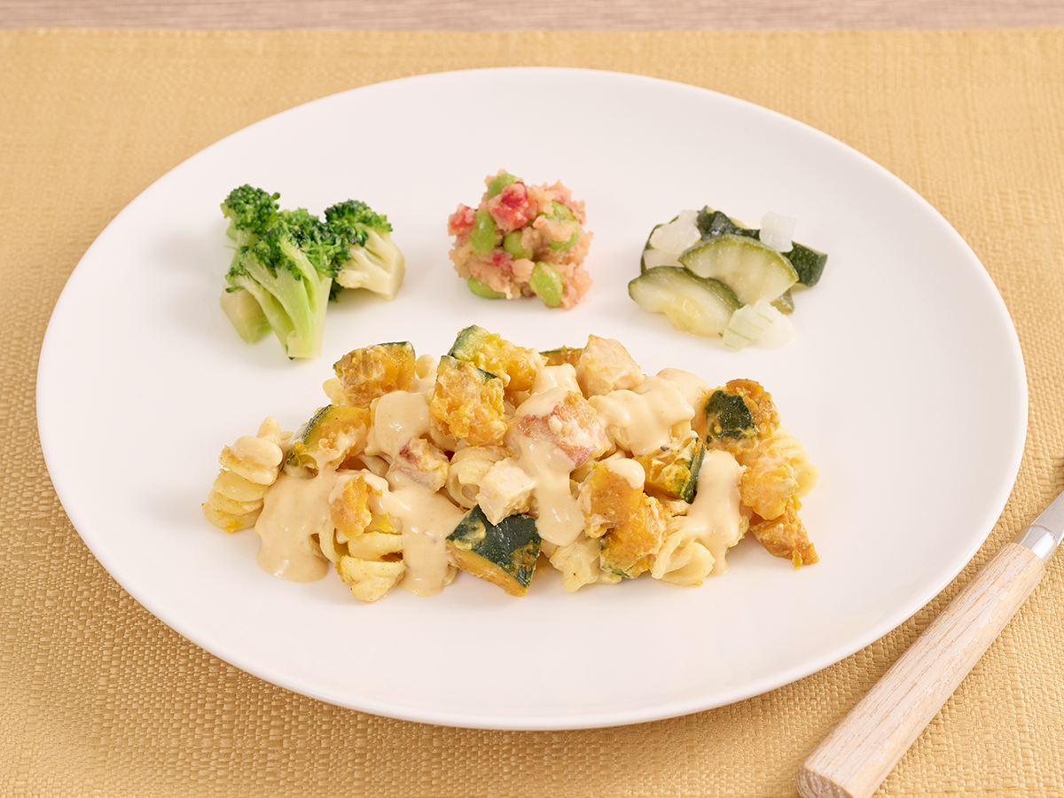 新感覚!カレーのスパイス×かぼちゃの甘み×芳醇な香りのカルボナーラソースがベストマッチ!奥深い、濃厚な味わいのソースをかぼちゃやパスタにしっかり絡めてお召し上がりください。