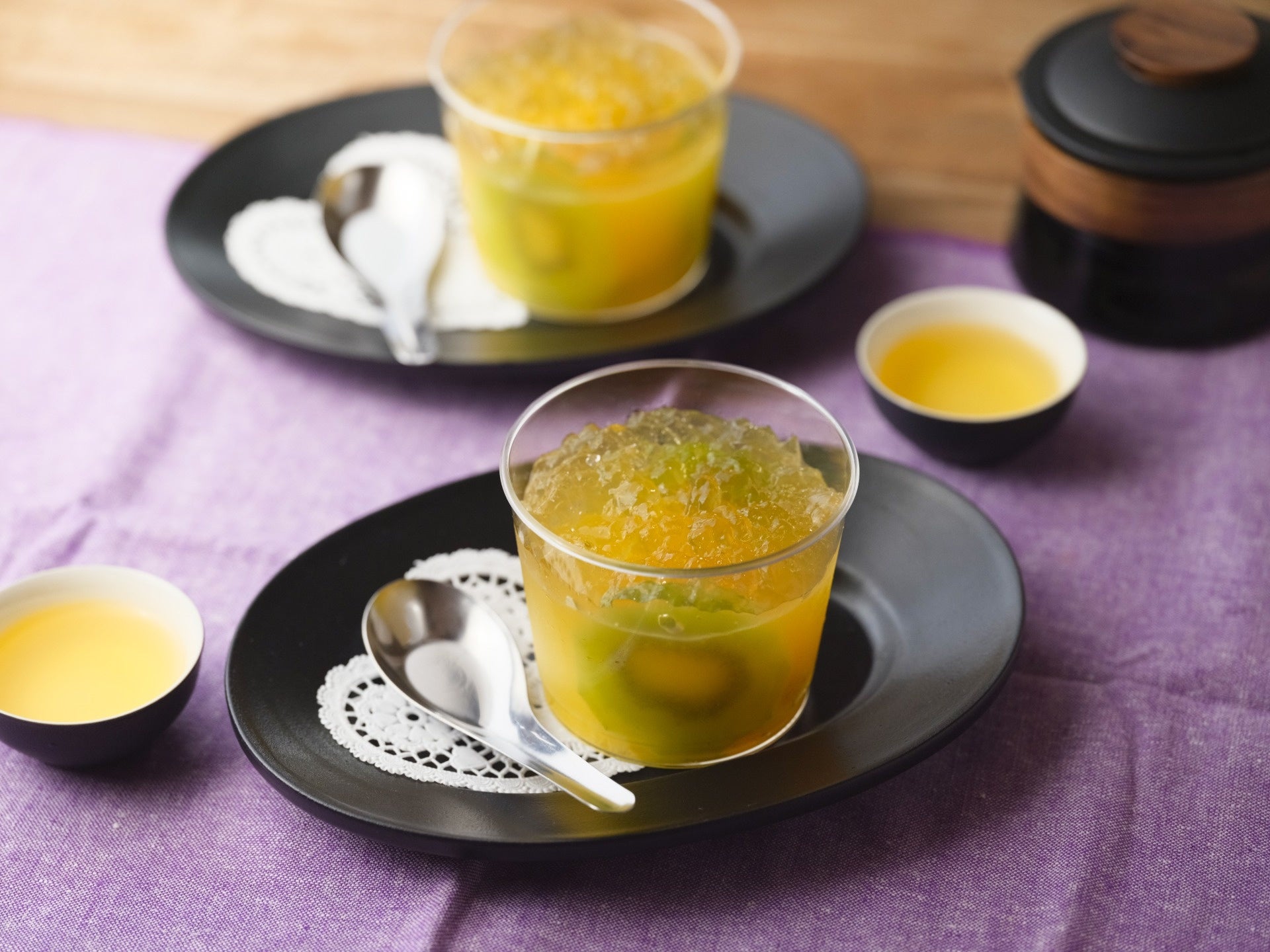 台湾フルーツティー(水果茶)をイメージしたデザートです。透き通った金色と花のような香りが特長の台湾凍頂烏龍茶のゼリーに、パイナップル、オレンジ、キウイの3種類のフルーツを加えて甘みと酸味をプラス。さらにジャスミンゼリーを組み合わせることで、爽やかな味わいをお楽しみいただける、見た目も華やかな一品です。