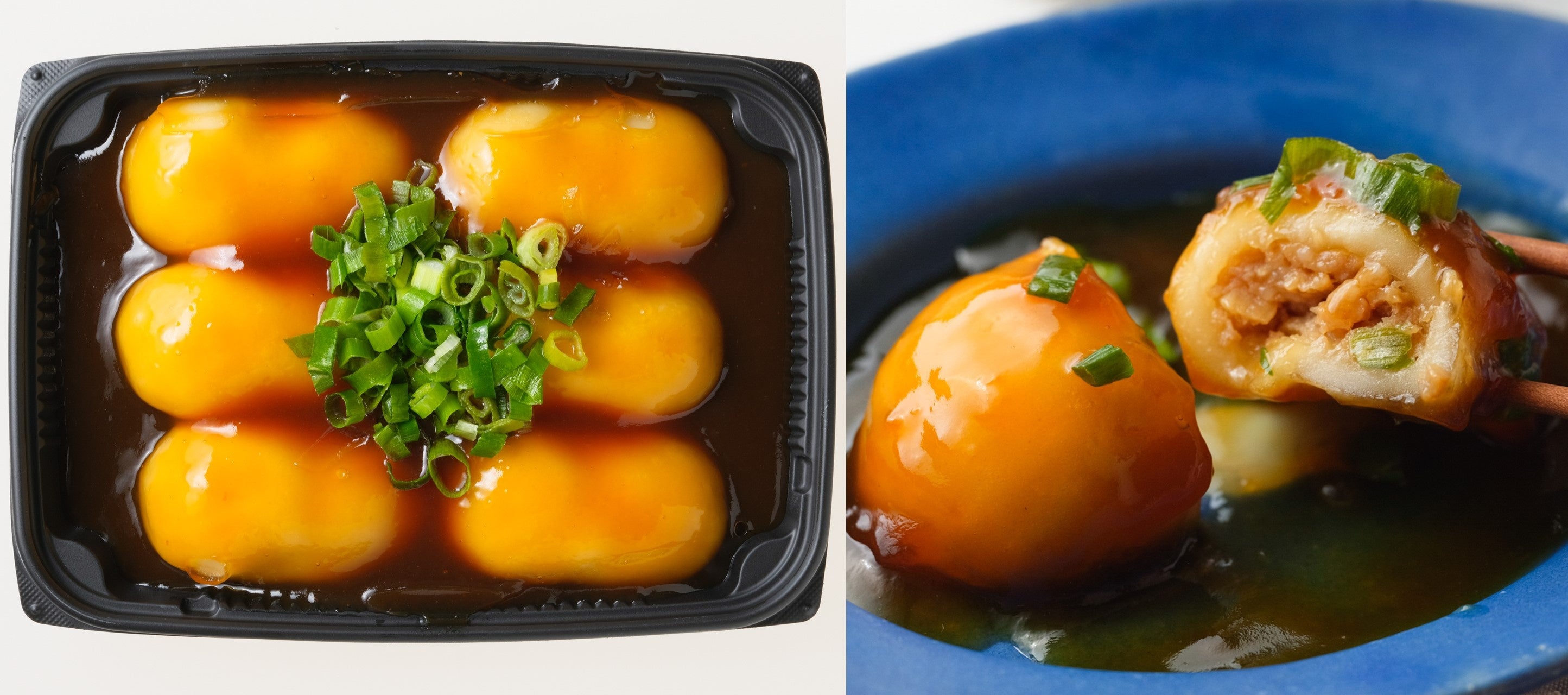 肉圓とは、片栗粉の皮でお肉の餡を包んで蒸したもの。甘めのタレを絡めてお召し上がりいただく点心です。惣菜として開発するにあたり、時間の経過とともに生地が固くなってしまうという課題がありました。そこで、片栗粉の皮に餅粉を配合し、開発者が30回もの試行錯誤を繰り返すことで、ご自宅で温め直してもおいしくお召し上がりいただける商品に。タレは、淡口醤油・たまり醤油・特選醤油の3種類の醤油を配合し、香りづけに八角を入れています。たっぷりとタレを絡めてお楽しみいただけるよう、薄めの味わいに仕上げました。