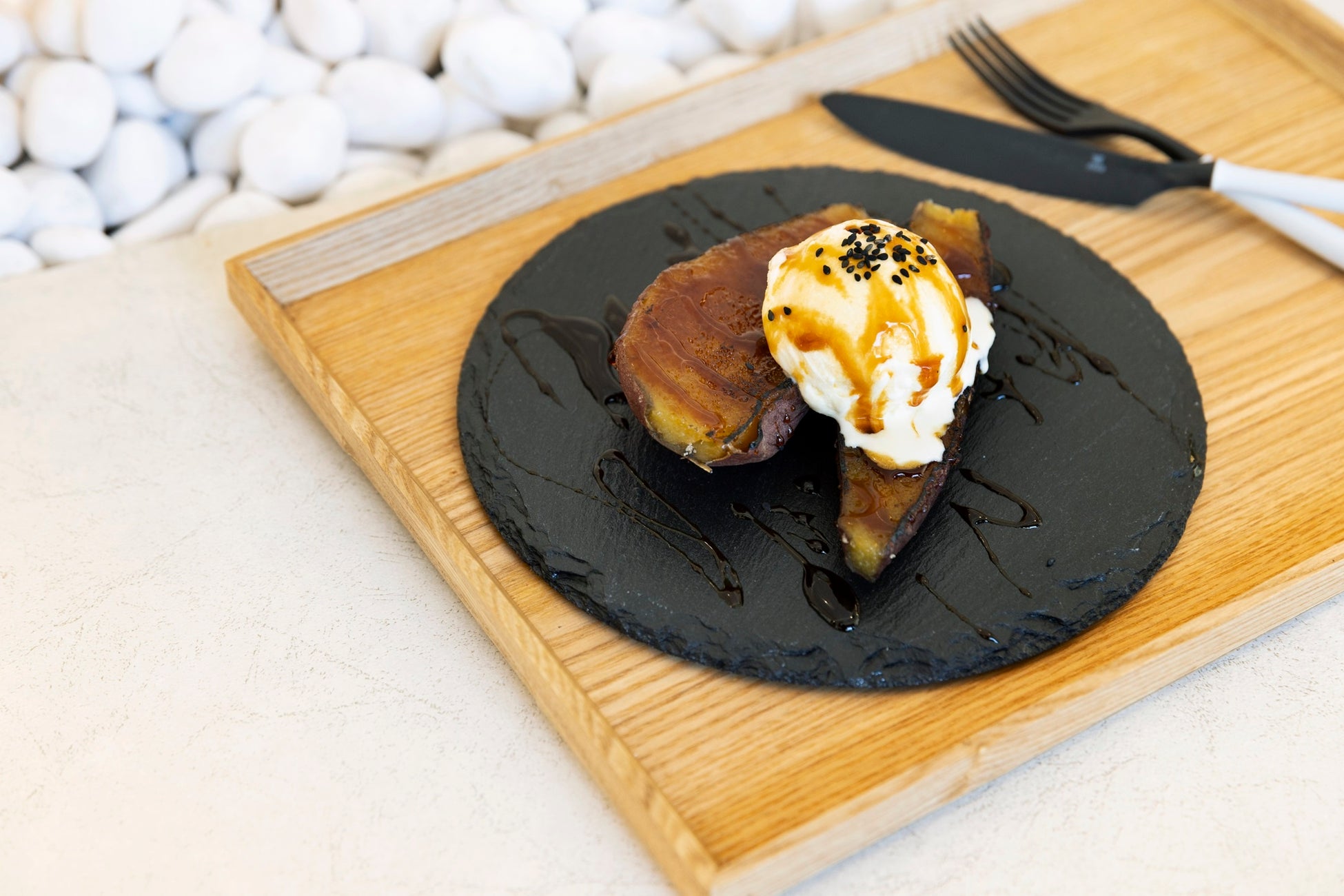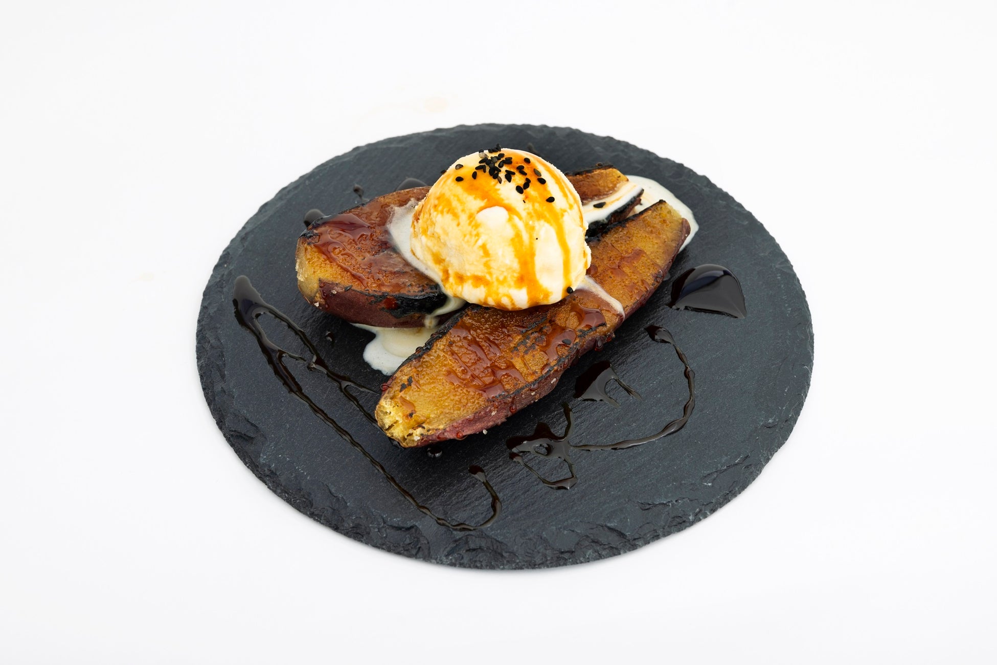ねっとりとした食感と高い糖度が特徴の「紅はるか」を、注文を受けてから表面をこんがり炙ってパリパリに仕上げ、バニラアイスを乗せて提供します。仕上げのソースにはカラメルをはじめ、山本山の抹茶とほうじ茶から作った自家製の抹茶ソース、ほうじ茶ソースよりお好きなソースをお選びいただけます。