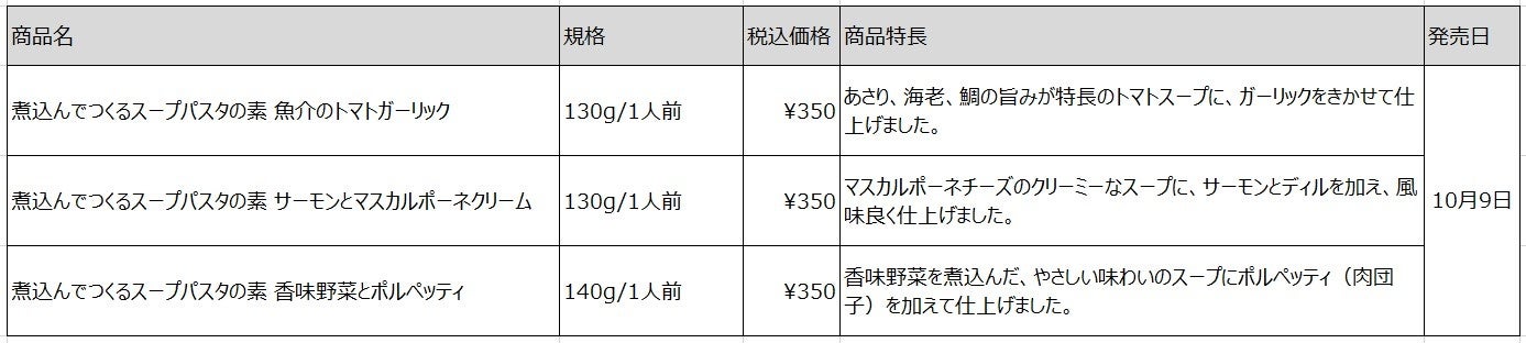 今回は、手軽なのに本格的な味わいを楽しむことができる、「煮込んでつくるスープパスタの素」として、イタリア現地の家庭料理の味をお手本にした「香味野菜とポルペッティ」の他、「魚介のトマトガーリック」、「サーモンとマスカルポーネクリーム」を発売します。