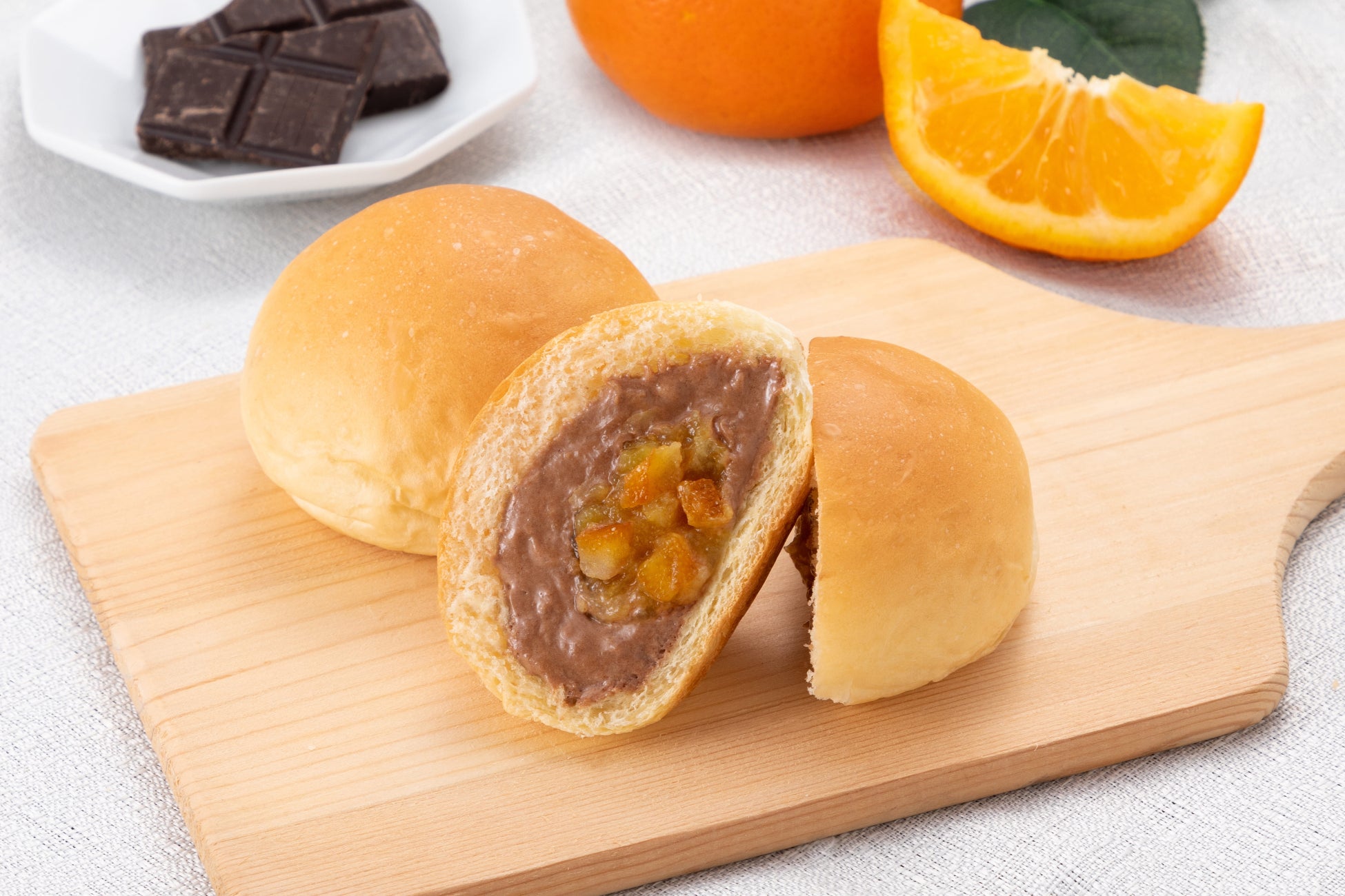 ふんわり柔らかなパンに、くちどけが良く甘さの中に少しほろ苦さのある濃厚なチョコレートクリームと、爽やかな酸味のあるオレンジピールの砂糖漬けを混ぜ込み、入れました。