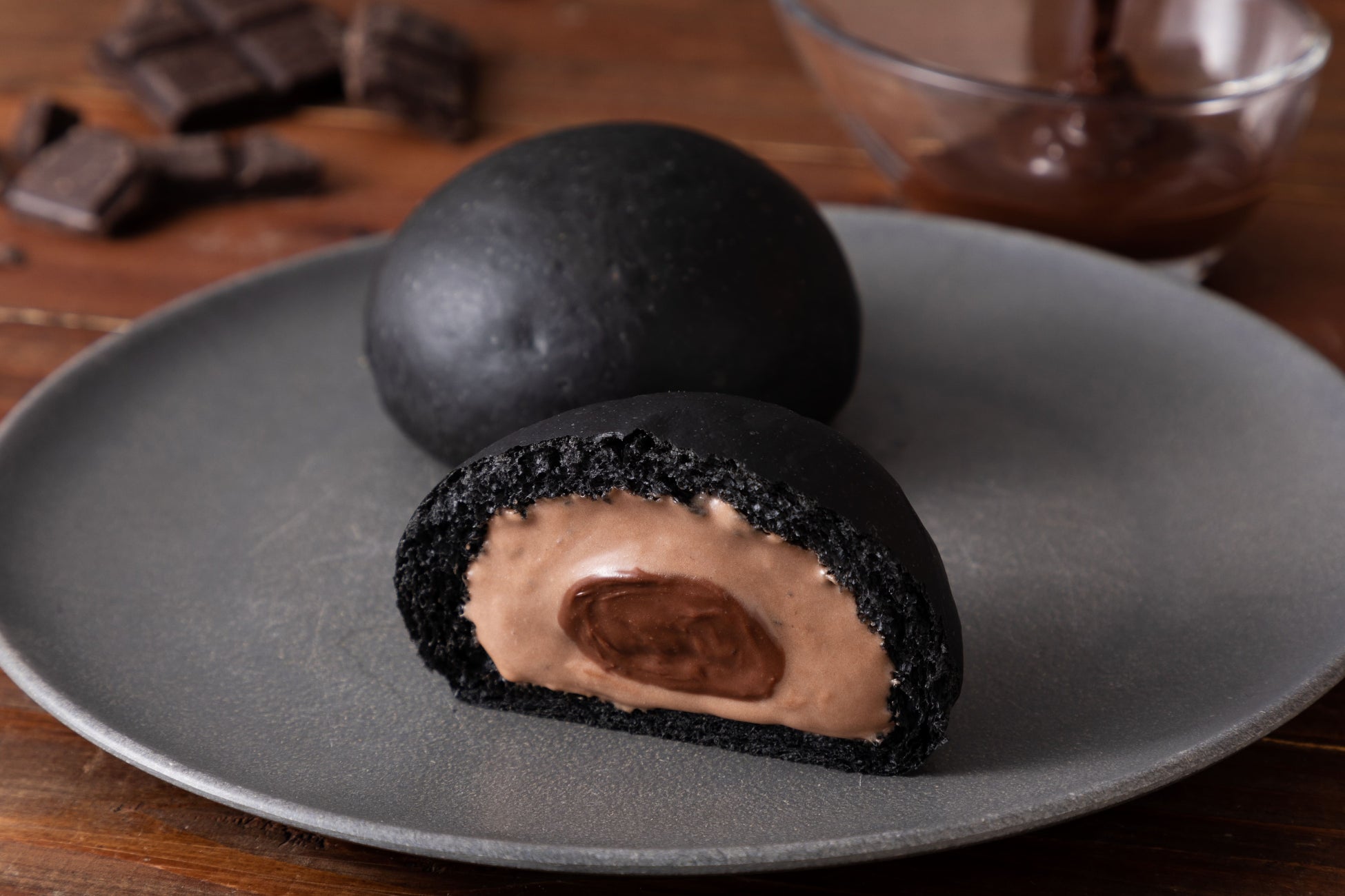 竹炭を練り込んだふんわり柔らかなパンに、ミルクチョコレートクリームと、生チョコレートを使用した濃厚なショコラクリームを入れました。