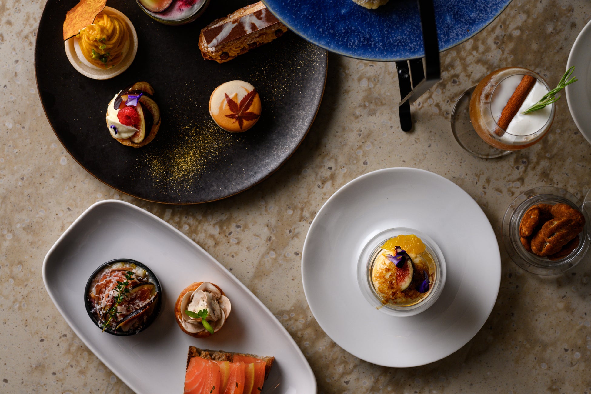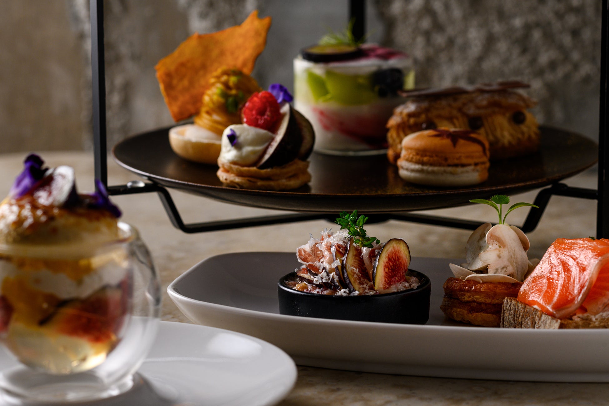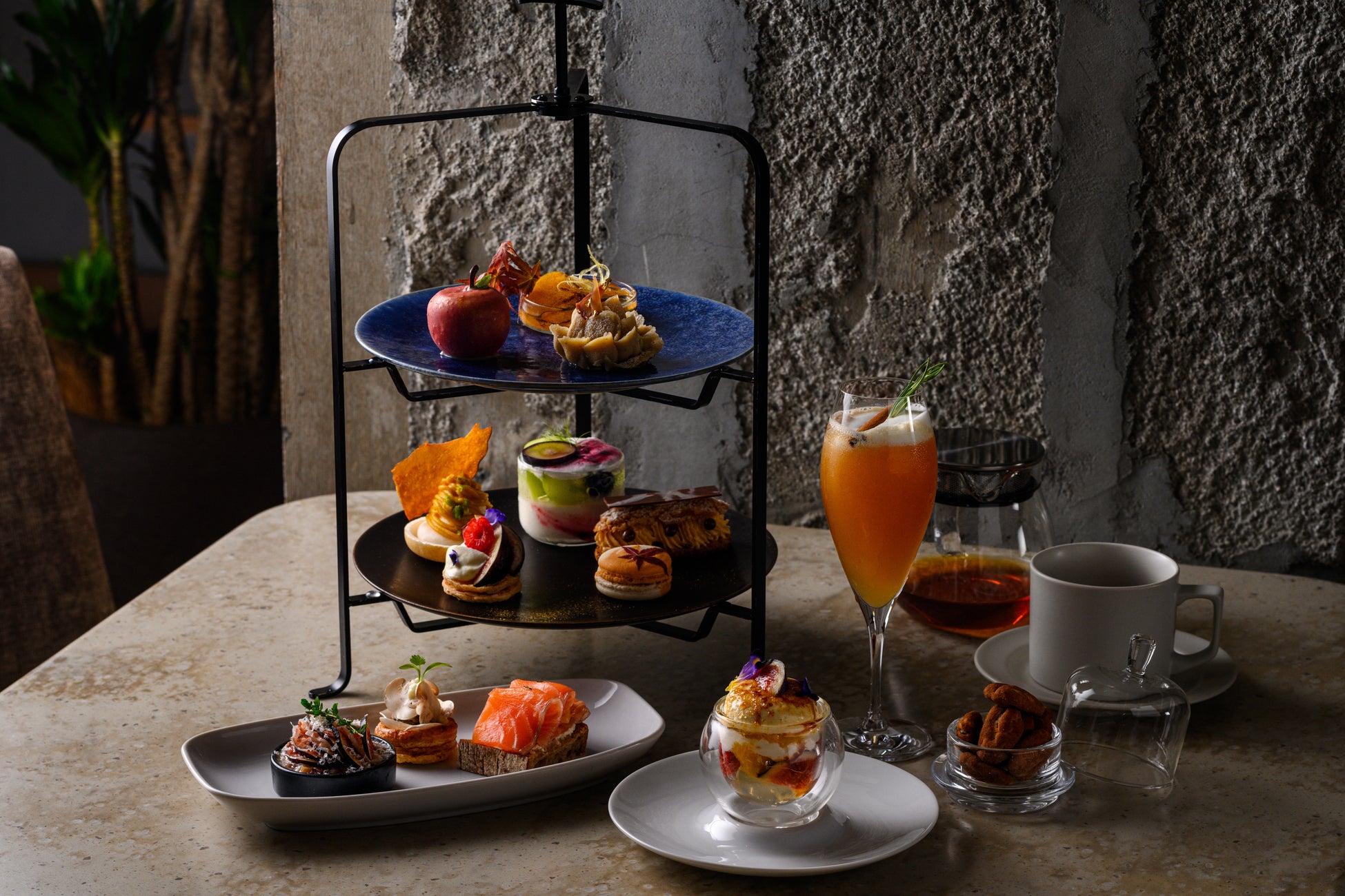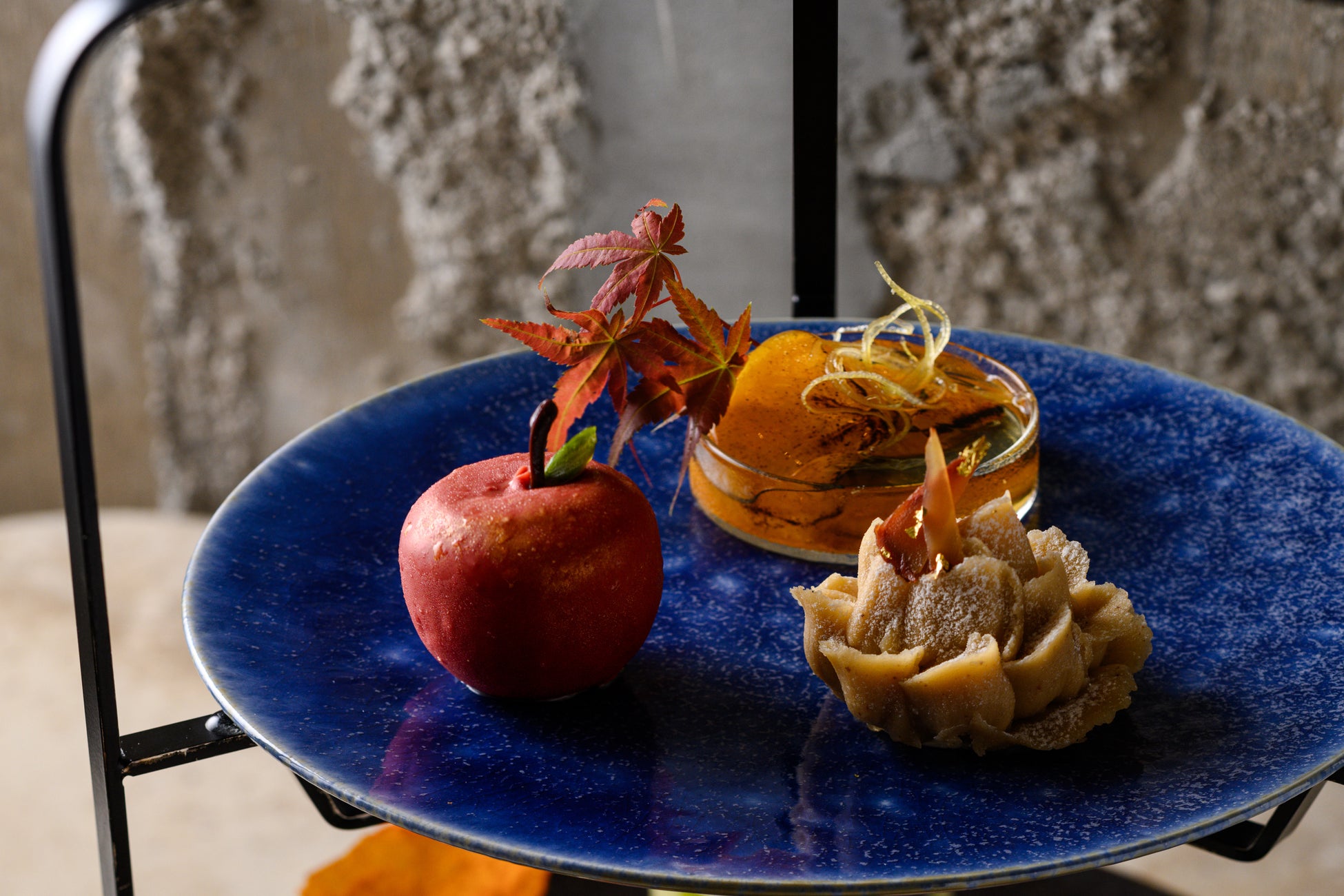 今回は秋の食材にフォーカスし、巨峰、いちじく、洋梨、柿、マロンなど、秋を代表するフルーツや食材を贅沢に使用。2段のティースタンドに、りんごの形が愛らしいチョコレート、紅茶、りんごのムース、巨峰とシャインマスカットのヨーグルトベリーヌ、かぼちゃと求肥のモナカ、そして濃厚な黒いちじくのミルフィーユなど、彩り豊かで心踊るデザートを盛り込みました。