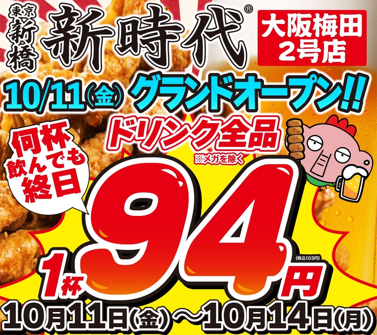 【お得に飲める絶好のチャンス!】新時代 大阪梅田2号店の新規オープンを記念して、10月11日(金)~10月14日(月)までメガ以外のドリンク全品、何杯飲んでも1杯94円(税込103円)イベントを開催いたします!