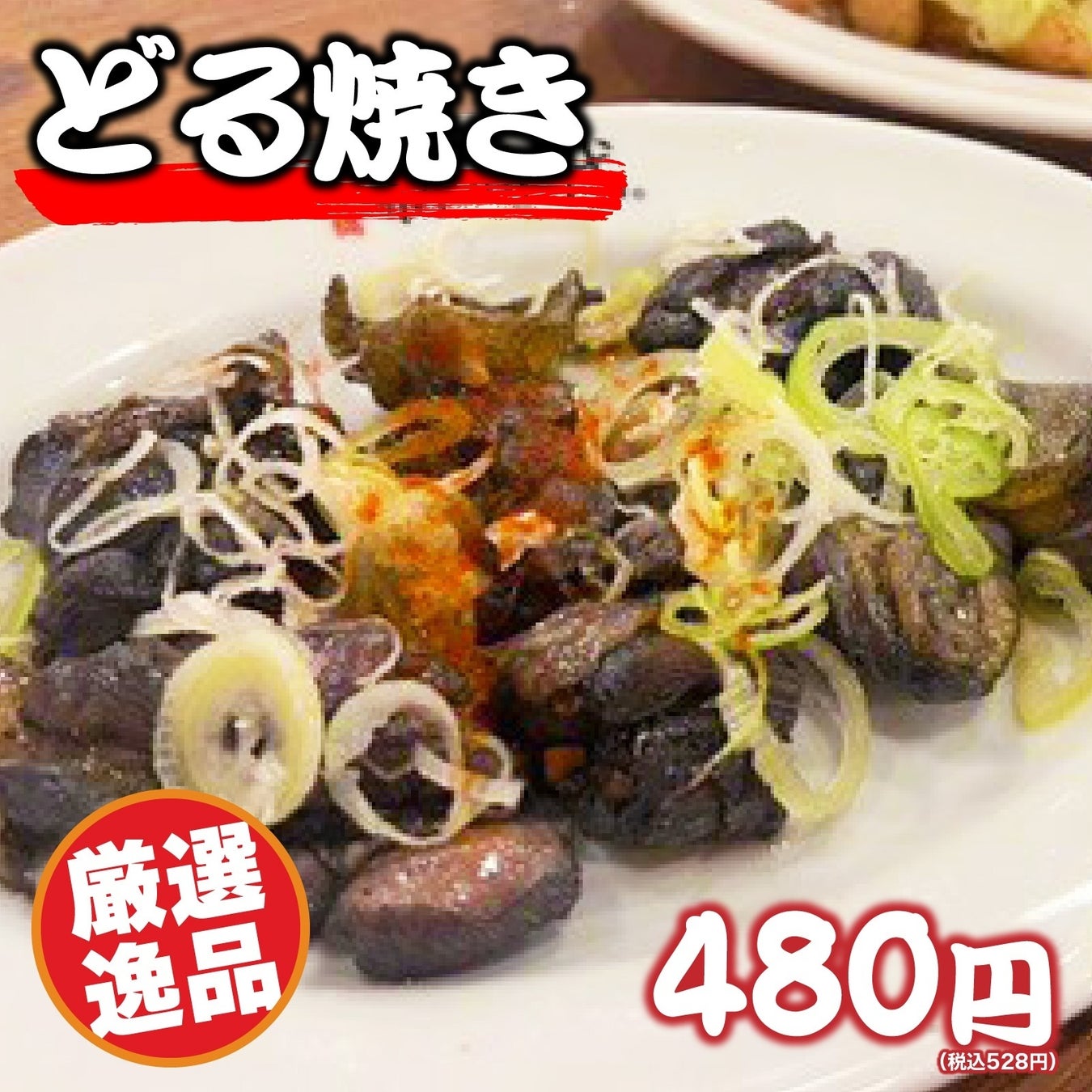 超弾力!噛めば噛むほど旨味が出る国産親鶏の炭焼きどる焼き(税込528円)お好みで柚子胡椒をつけていただくことができます。コリコリ食感がたまらない1度食べたらもう一度食べたくなる味。