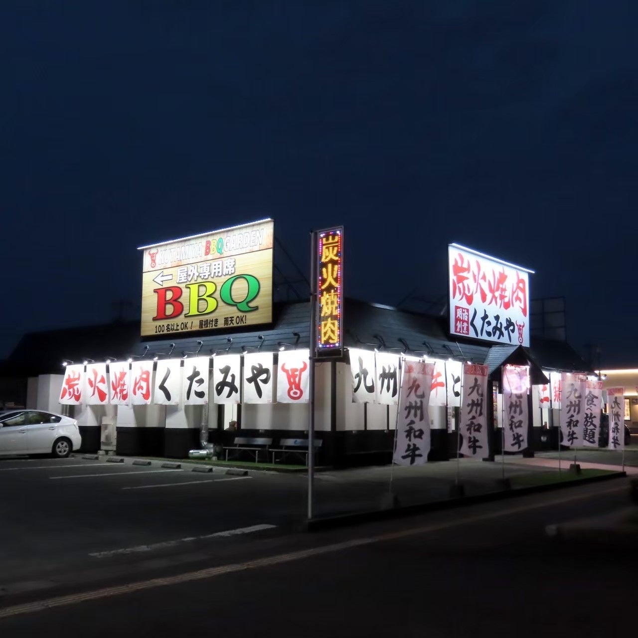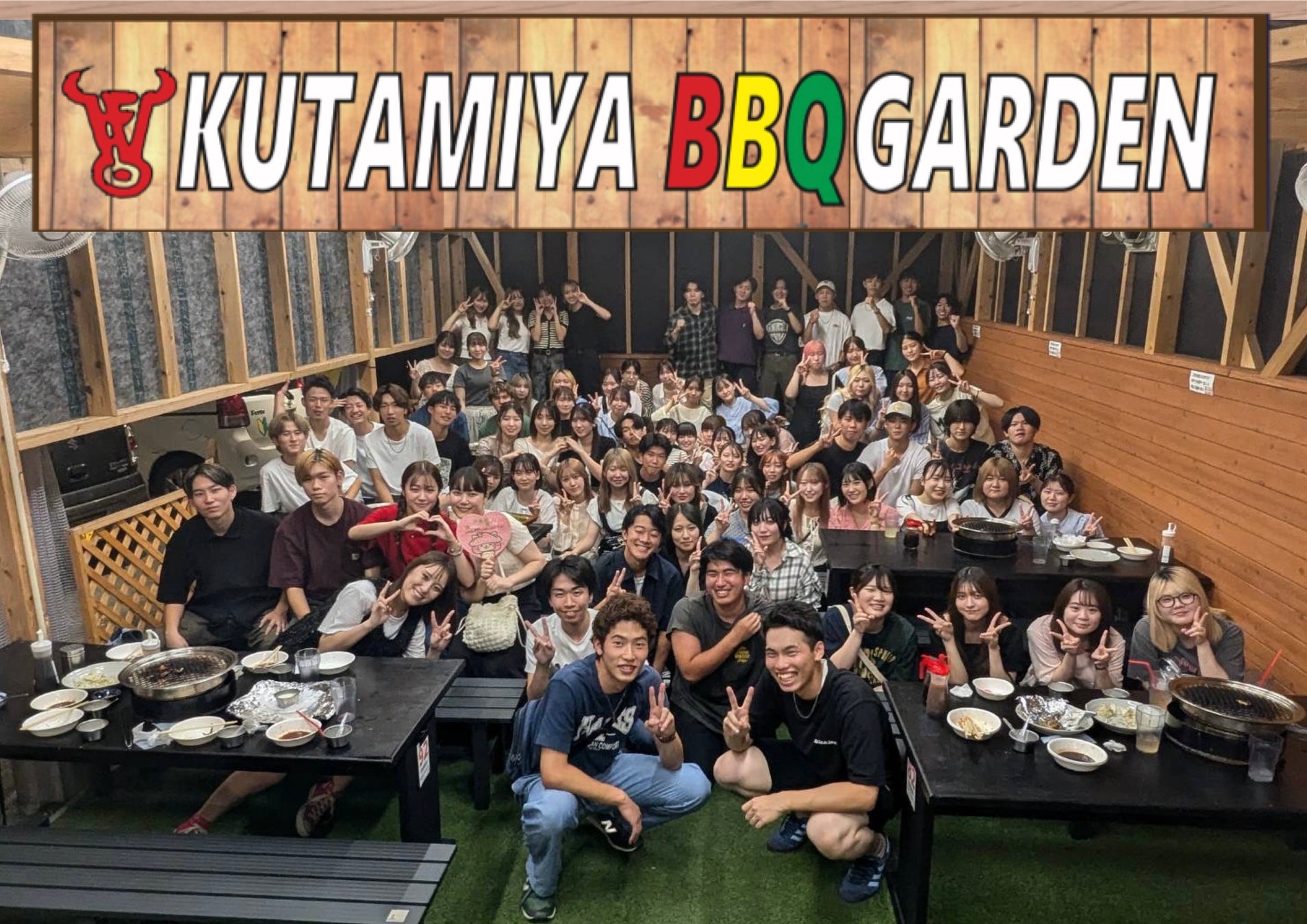 「炭火焼肉くたみや」は九州和牛、土鍋ご飯をはじめ豊富なメニューがあるのでファミリー層にも大人気です。また大宴会場も完備、最大60名まで収容可能。食べ放題プラン、宴会コースも充実しております。屋外BBQガーデンは雨天時でもご利用可能で最大72名収容できます。(仮設テントで100名以上でもOK)家族や友人、会社の懇親会、部活の打ち上げなど大人数で楽しむことができます。店内でも屋外でも楽しめる熊本県初‼︎のハイブリッド焼肉店です。