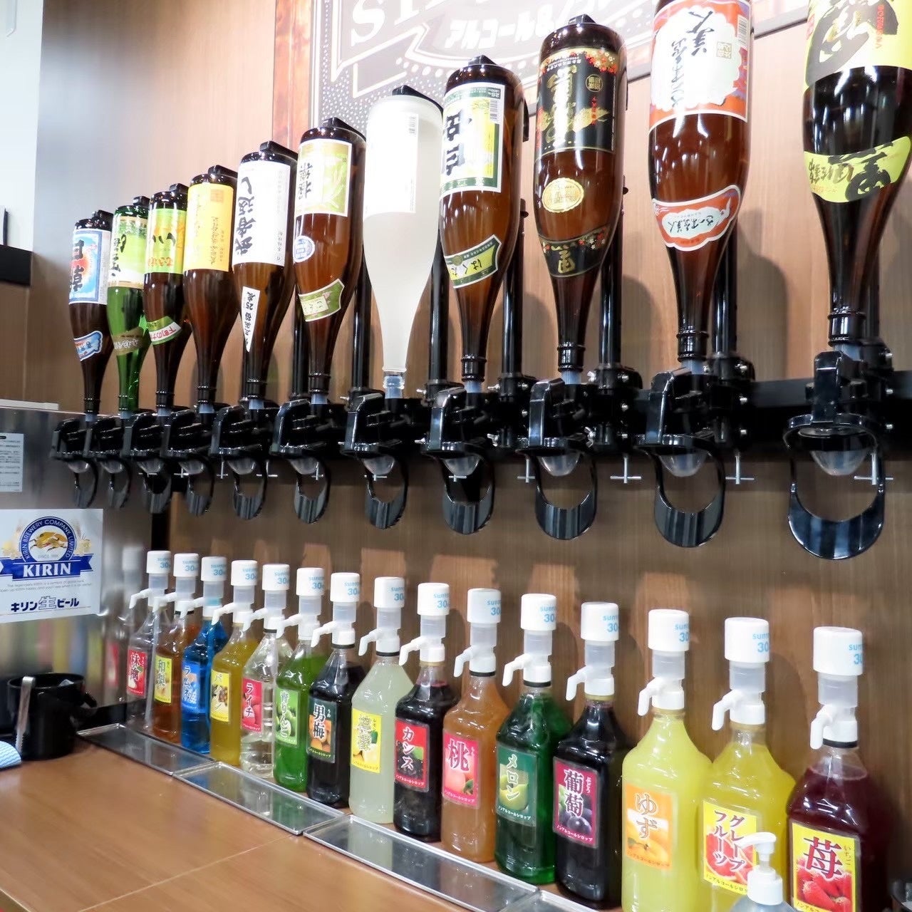 アルコールは、淡麗樽生やハイボール、レモンサワー、焼酎12種(米、芋、麦、蕎麦など)、日本酒やワインなどを多数ご用意。ドライバーやお酒を飲めない方もノンアルコールシロップを10種類以上取り揃えていますので、あらゆる組み合わせのノンアルコールカクテルを自分で作れます!