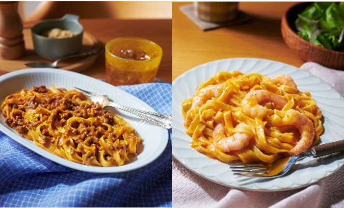 今回は、パスタの定番具材である肉と魚介で、新しい味を追加しました!肉は、「ボロネーゼ」。牛挽肉をたっぷり入れ、にんにくを効かせた満足感のある商品です。魚介は、「海老のビスクソース」。ごろっとした海老に、海老のペースト・オイル・パウダーを使ったソースをかけた濃厚感を感じられる商品です。もっちり食感のパスタと、お肉や海老の旨味を楽しめるので、ぜひお召し上がりください!