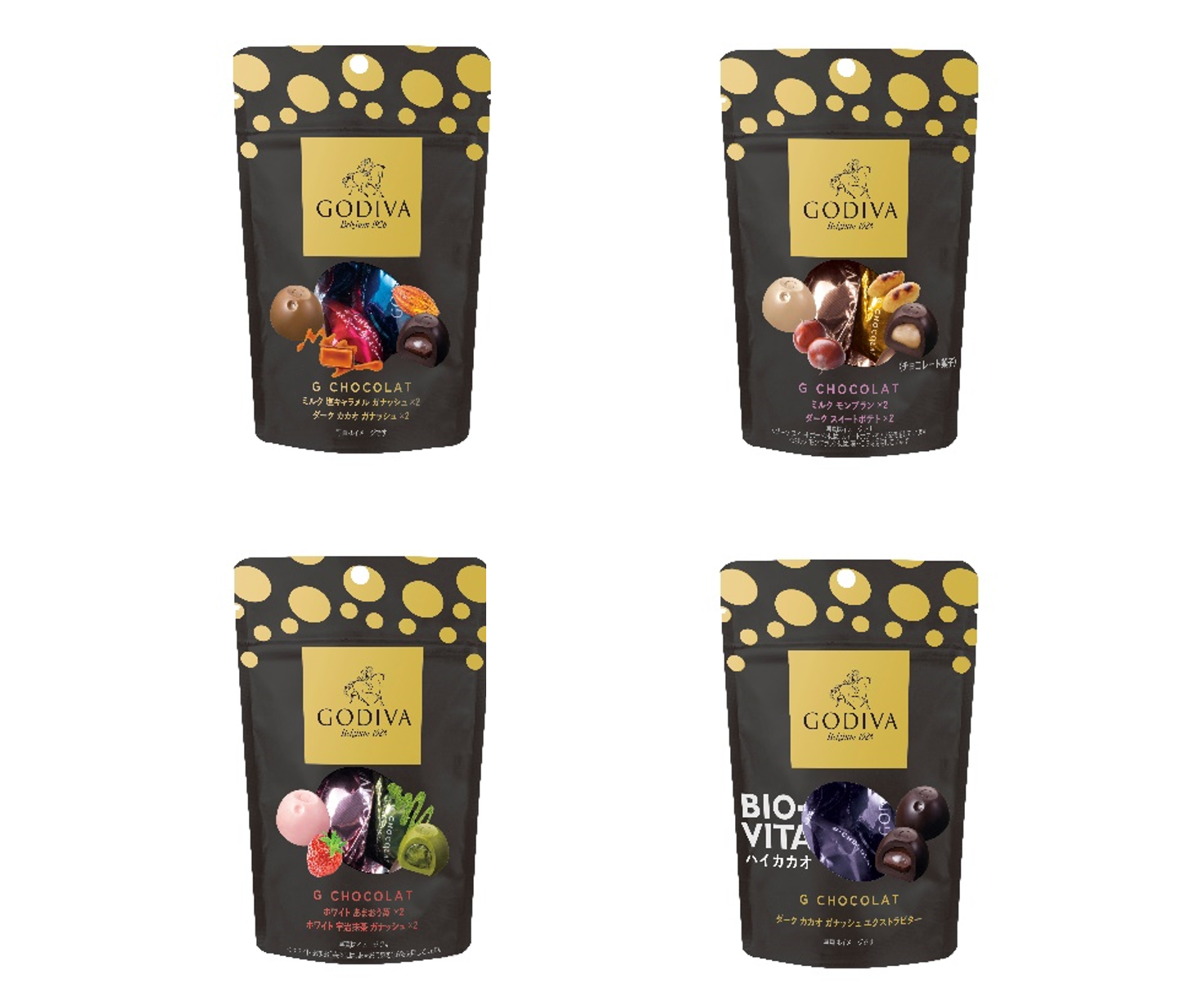 左上から時計回りに、G ショコラ 4粒入 (塩キャラメル×2粒/ダーク×2粒)、G ショコラ 4粒入 (スイートポテト×2粒/モンブラン×2粒)、G ショコラ 4粒入 (エクストラビター×4粒)、G ショコラ 4粒入 (あまおう苺×2粒/宇治抹茶×2粒)、