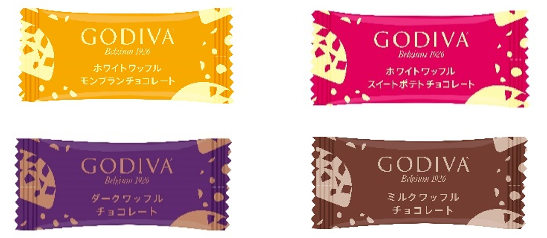 左上から時計回りに、限定フレーバー ホワイトワッフルモンブランチョコレート、限定フレーバー ホワイトワッフルスイートポテトチョコレート、ミルクワッフルチョコレート、ダークワッフルチョコレート
