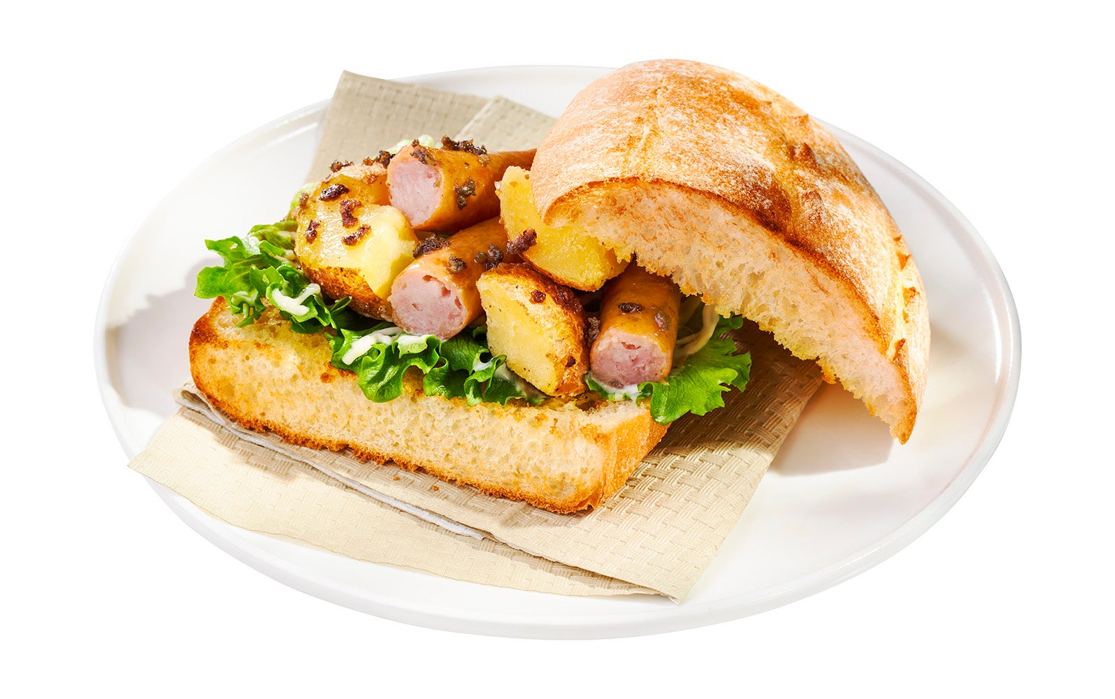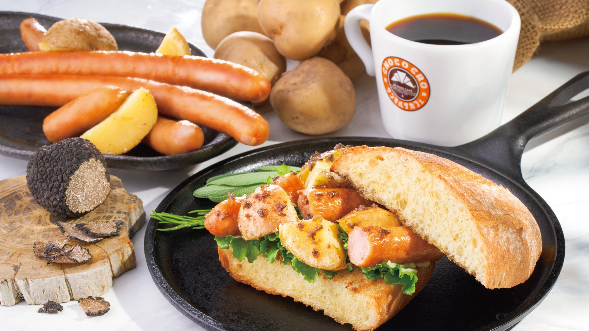 本メニューは、外側がパリパリ、中はもちもち食感のパンとフレッシュなフリルレタスを使用しいます。それに加えて、大きめにカットされた北海道産ポテトを、よりほくほく感を出すために、一度軽く焼き上げ、塩こしょうの味付けをしてからサンドしています。また、肉汁たっぷり溢れるジューシーな粗挽きウインナーは、食べた時のパリッとした食感もお楽しみいただけます。そして、ホワイトマッシュルームをベースに、香り豊かなトリュフを加えたペーストをサンドすることで、トリュフの上品な香りが、食べる前からも感じることができます。抜群の食べ応えと、食材の味わいを存分にお楽しみいただけるホットサンドです。