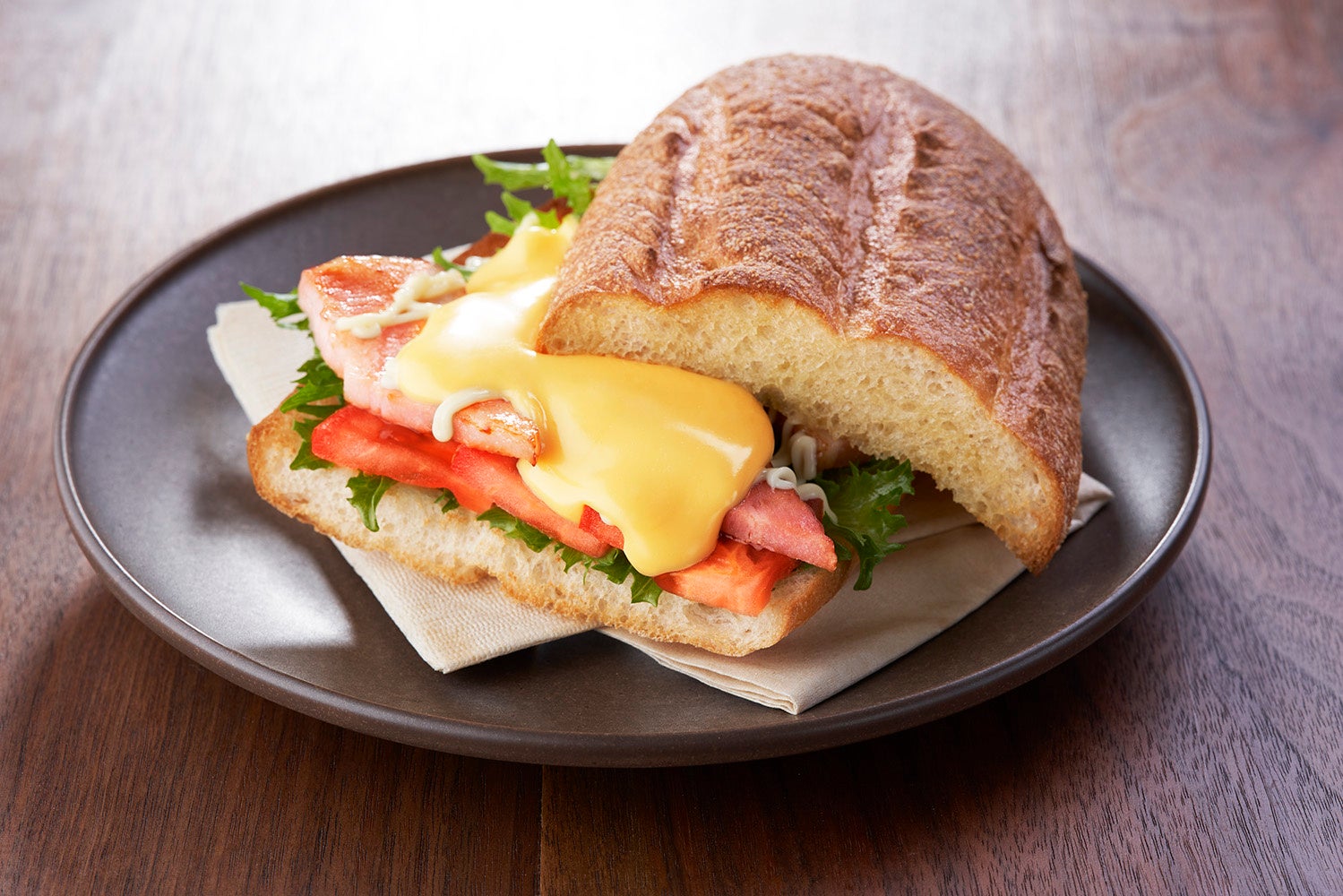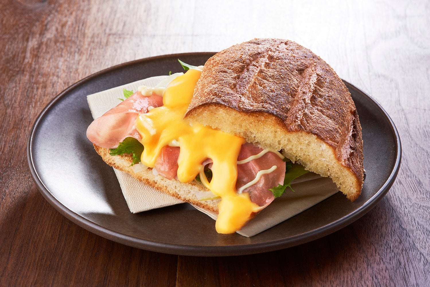 ハムとチーズの絶対的に美味しい組み合わせの商品。チェダーチーズの優しい塩味と柔らかいハムが魅力的で、フリルレタスや玉ねぎの食感もアクセントとなります。