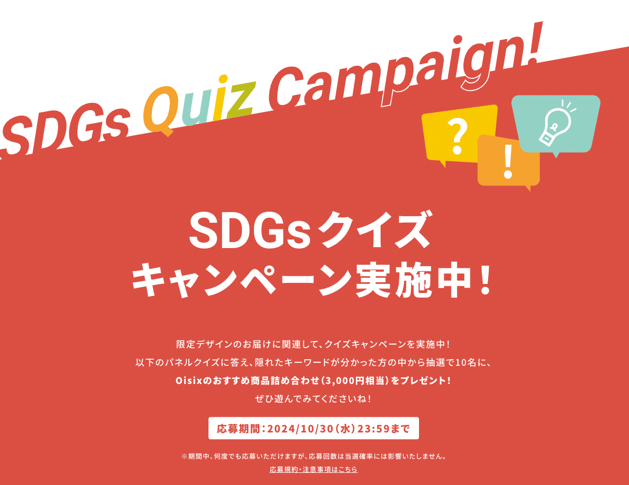 今回の期間限定デザインでの商品お届けに合わせて、キャンペーンを実施中です。「Oisixデザインミュージアム」特設サイトに掲載されたクイズに答え、パネルに隠れたキーワードを入力いただいた方の中から抽選で10名に「Oisixの人気食材」詰め合わせ(3,000円相当)をプレゼントします。